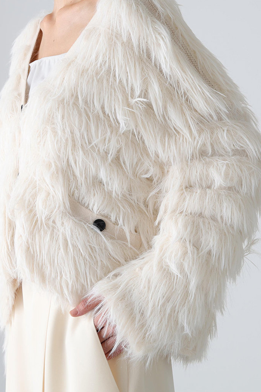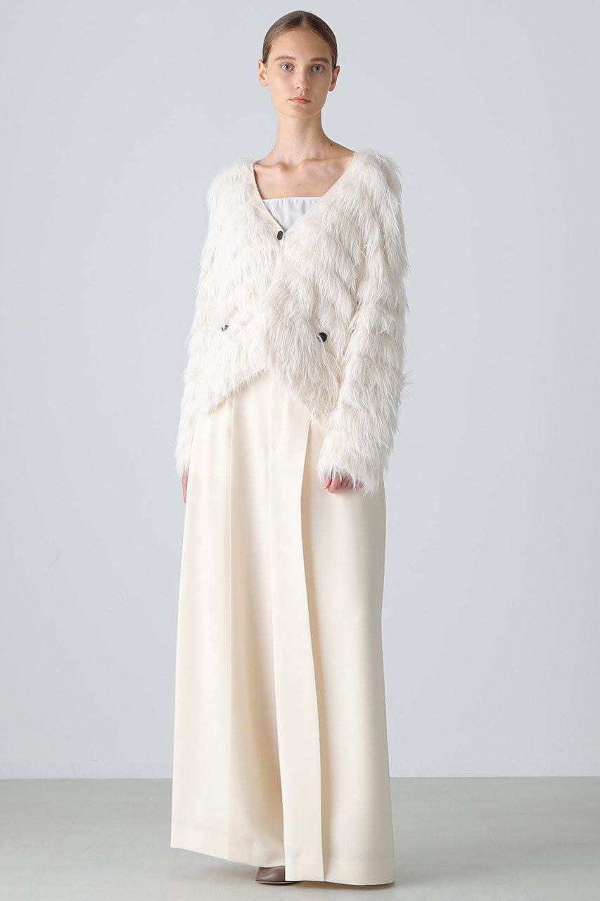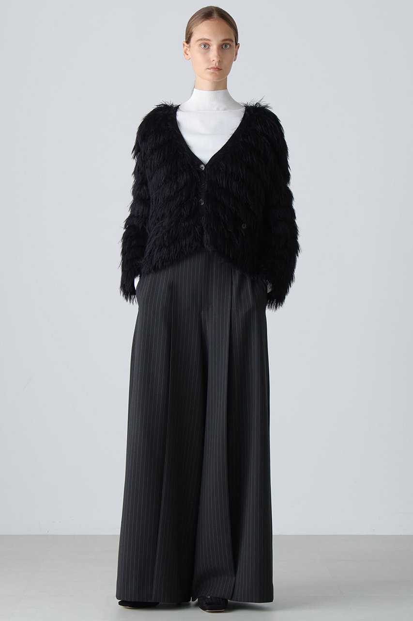 毛足の長いロングシャギー糸を使用した、存在感たっぷりのニットカーディガン。短めの着丈とコンパクトなフォルムがバランス良く、どんなボトムとも好相性。ナイロンの意匠糸とウール梳毛糸を編み分けたことで、ふんわりとしたヘアリーな質感を実現。