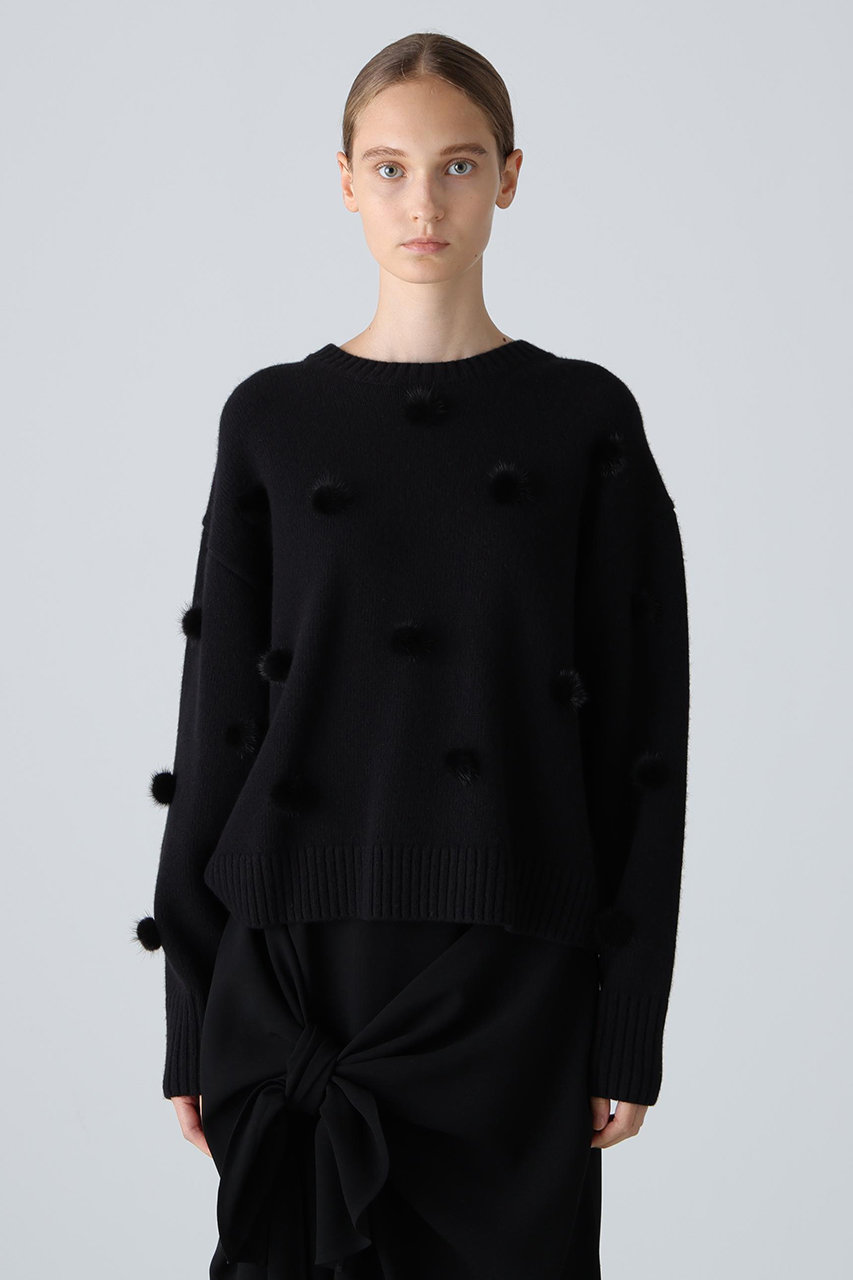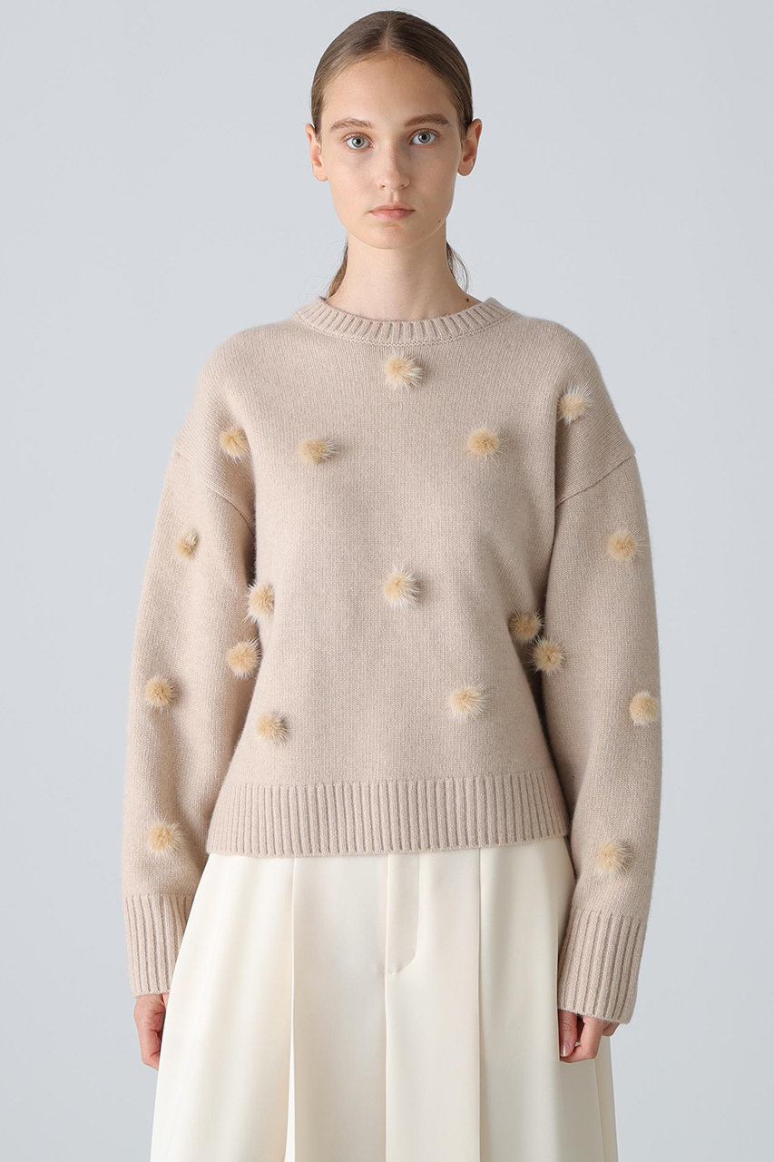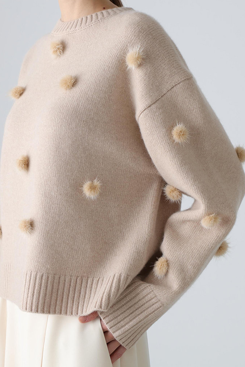 ミンクのファーボールをあしらった、華やかで遊び心のあるニット。30mmのミンクボールが程よい存在感を放ち、ポップになりすぎず大人の女性にふさわしい上品さを演出。カシミヤをブレンドしたメリノウールの紡毛糸で仕立てた柔らかな風合いが魅力。