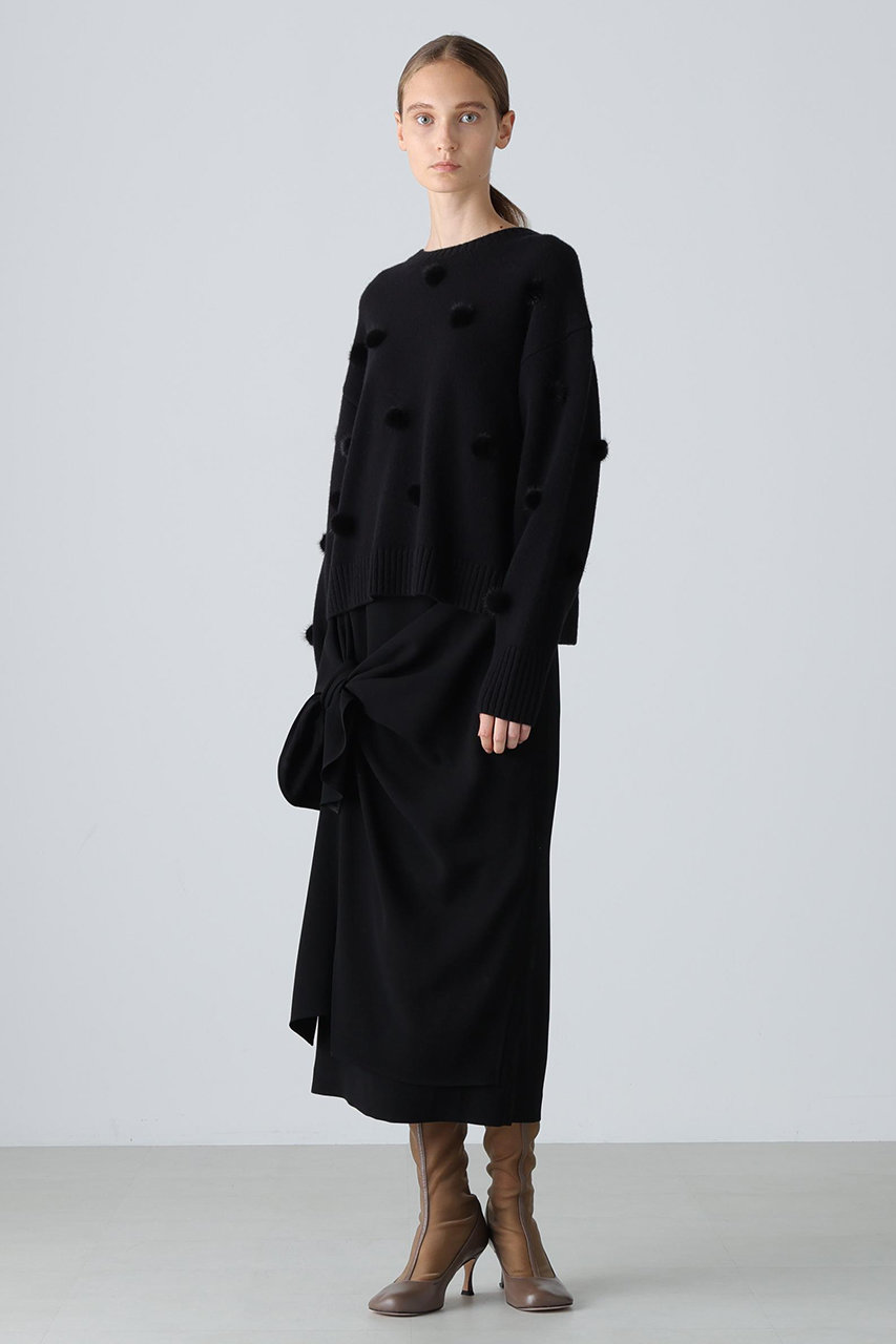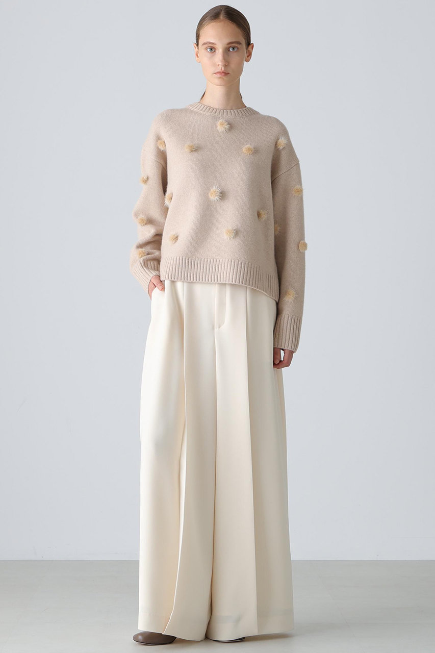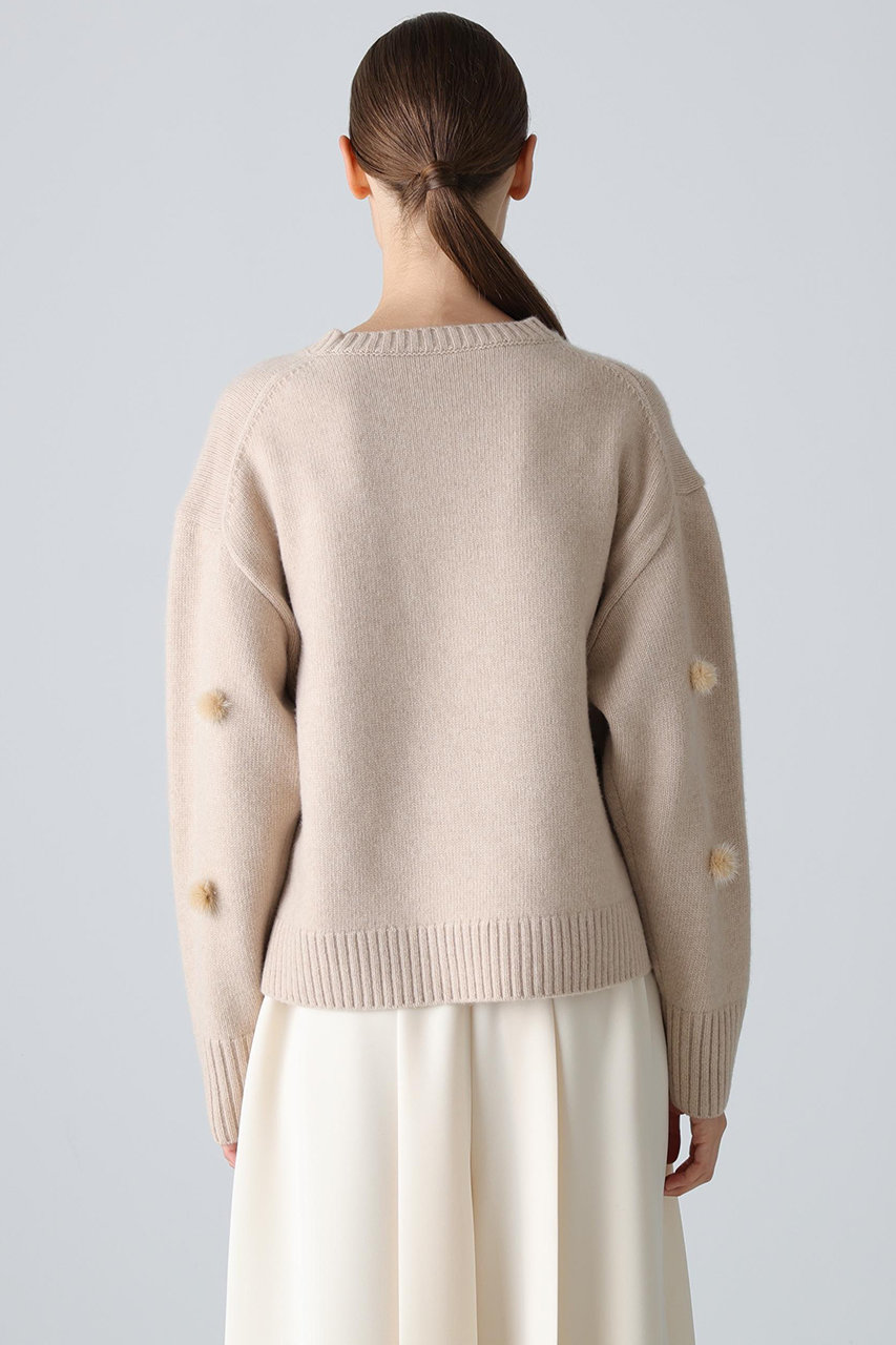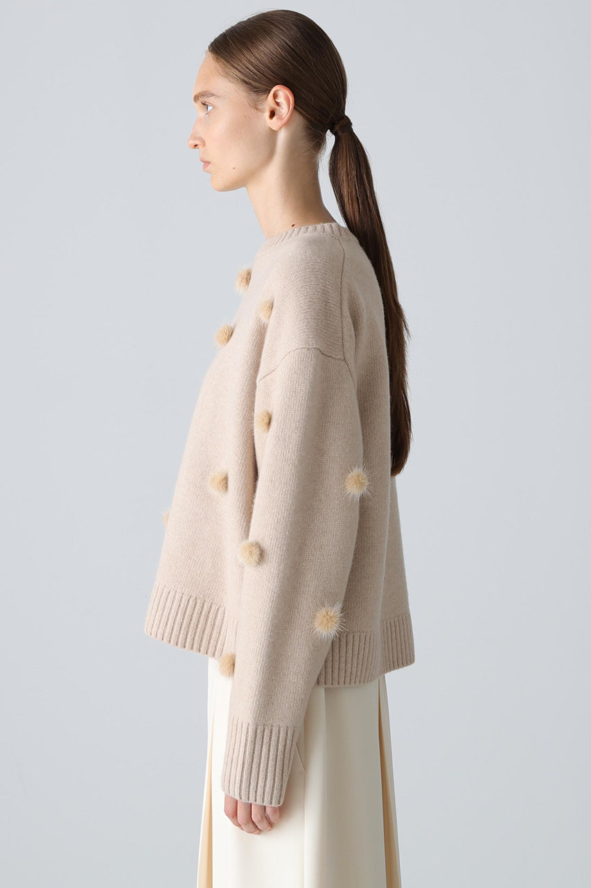 ミンクのファーボールをあしらった、華やかで遊び心のあるニット。30mmのミンクボールが程よい存在感を放ち、ポップになりすぎず大人の女性にふさわしい上品さを演出。カシミヤをブレンドしたメリノウールの紡毛糸で仕立てた柔らかな風合いが魅力。