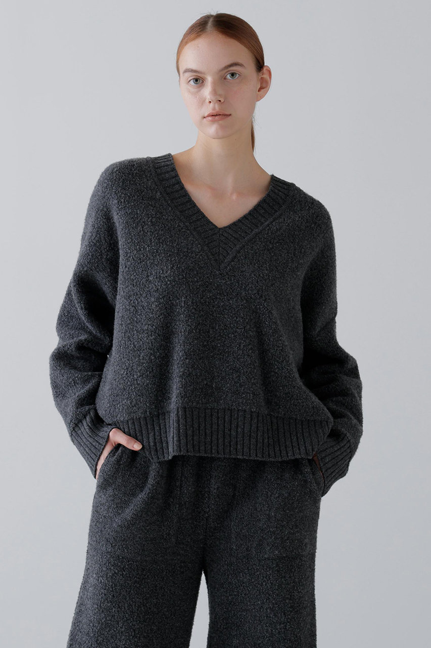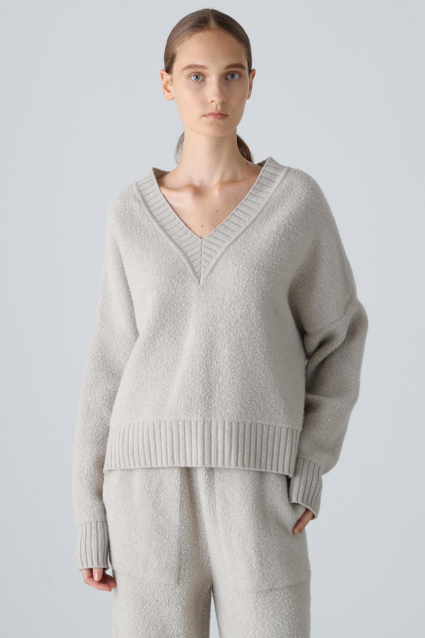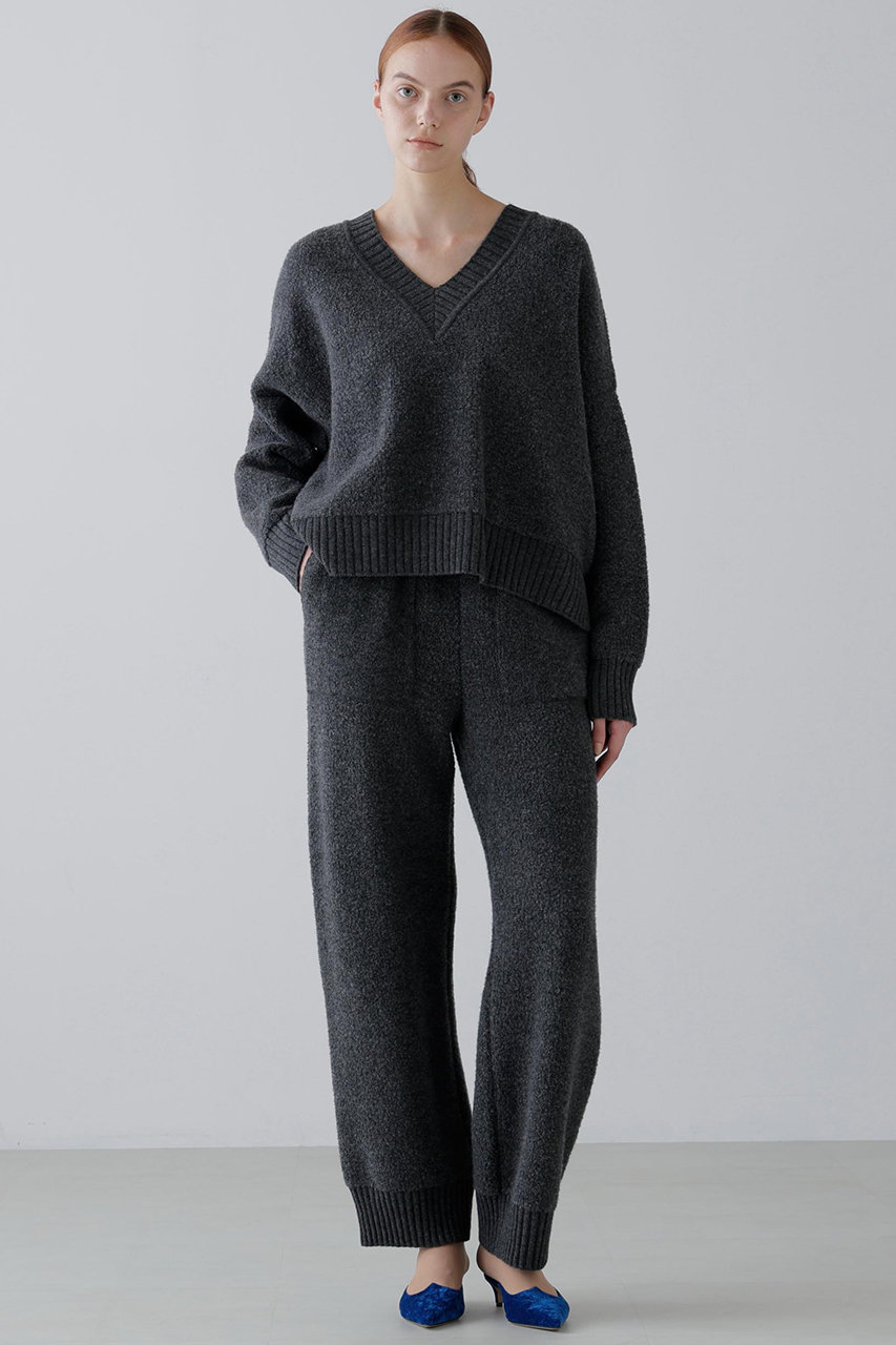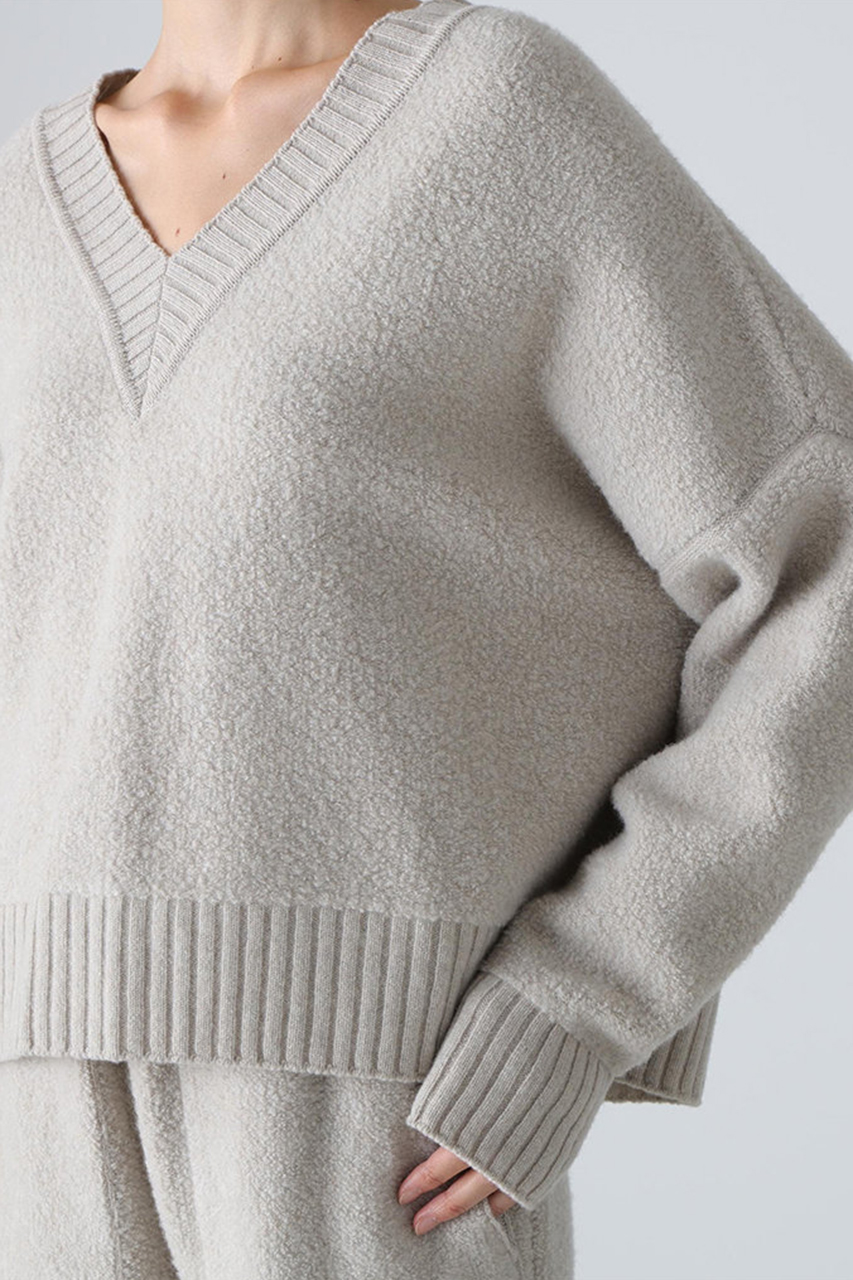 パイル面と天竺面、両面で着用できるリバーシブル仕様のニットプルオーバー。ややオーバーサイズのシルエットに短めの着丈を組み合わせ、リラクシーなムードを演出。メリノウール特有の膨らみと軽さを持つ紡毛糸を使用し、カシミヤ仕上げ同様に縮絨した仕上がり。同素材のパンツとのセットアップスタイルもおすすめ。