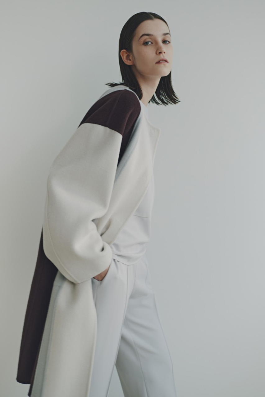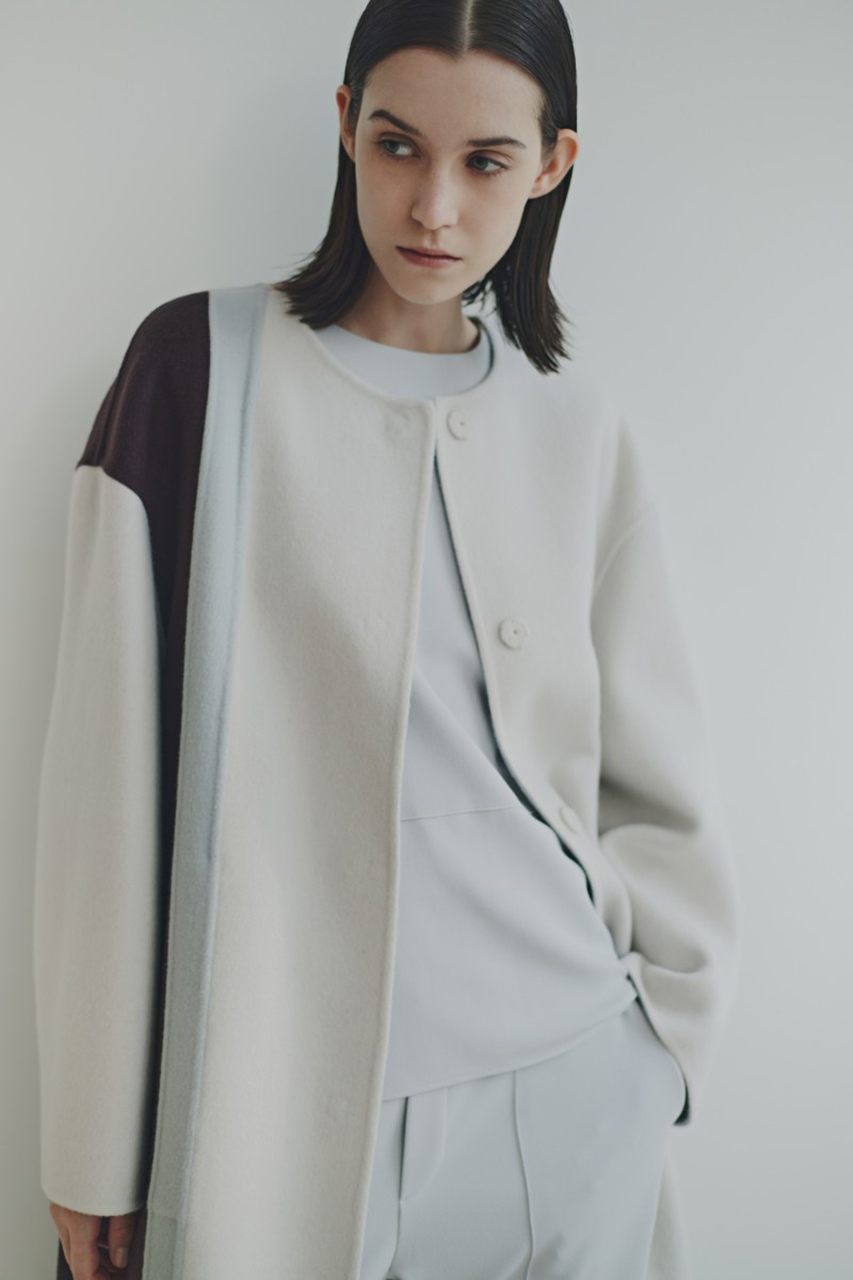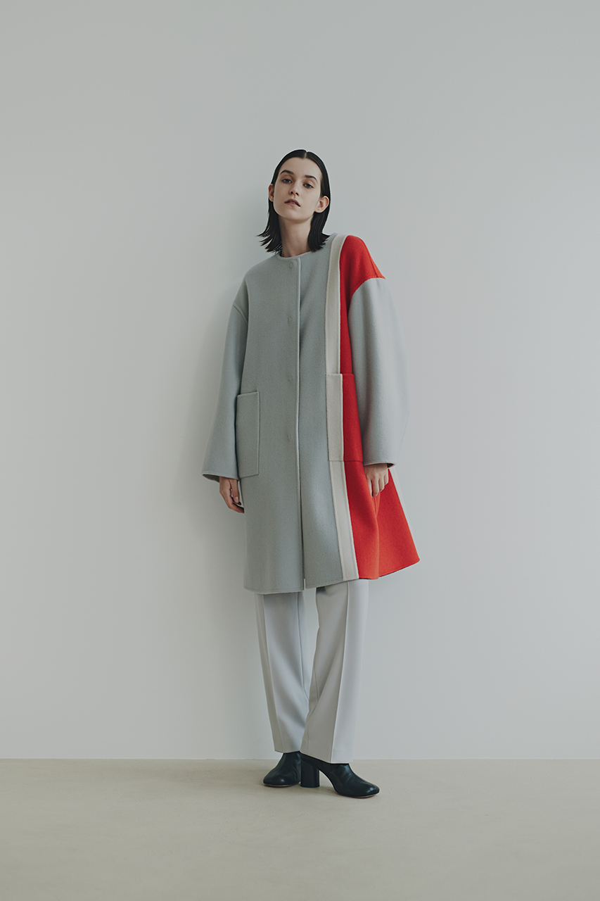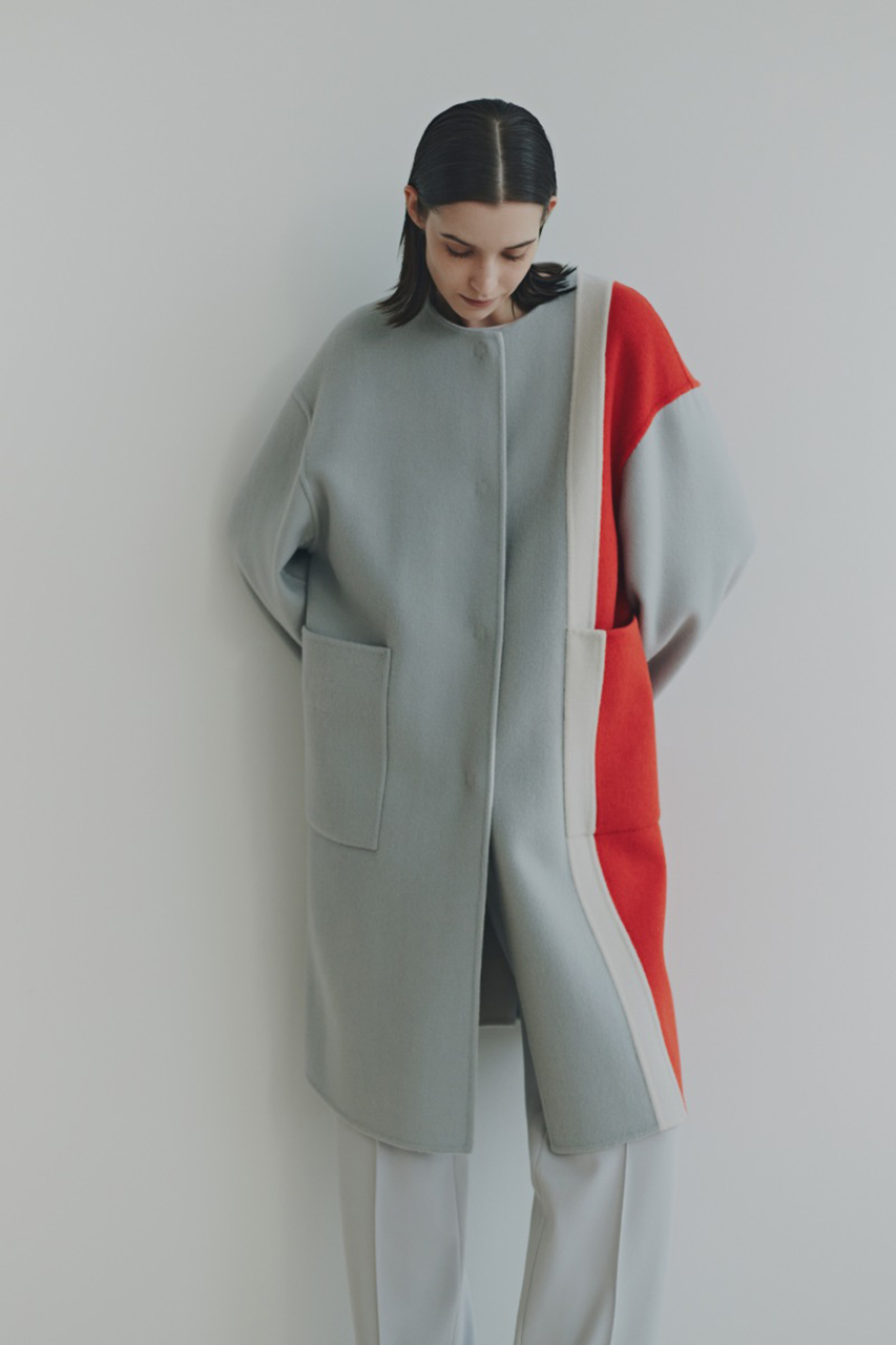 定番であるノーカラーコートは、ギミックが効いたデザインで秋冬の装いを華やかにグレードアップ。片側の身頃には、縦に2色のラインが入りグラフィカルなムードに。インパクトのある配色が、存在感たっぷりの1着。カシミアがミックスされた、なめらかな手触りはあたたかさも十分。