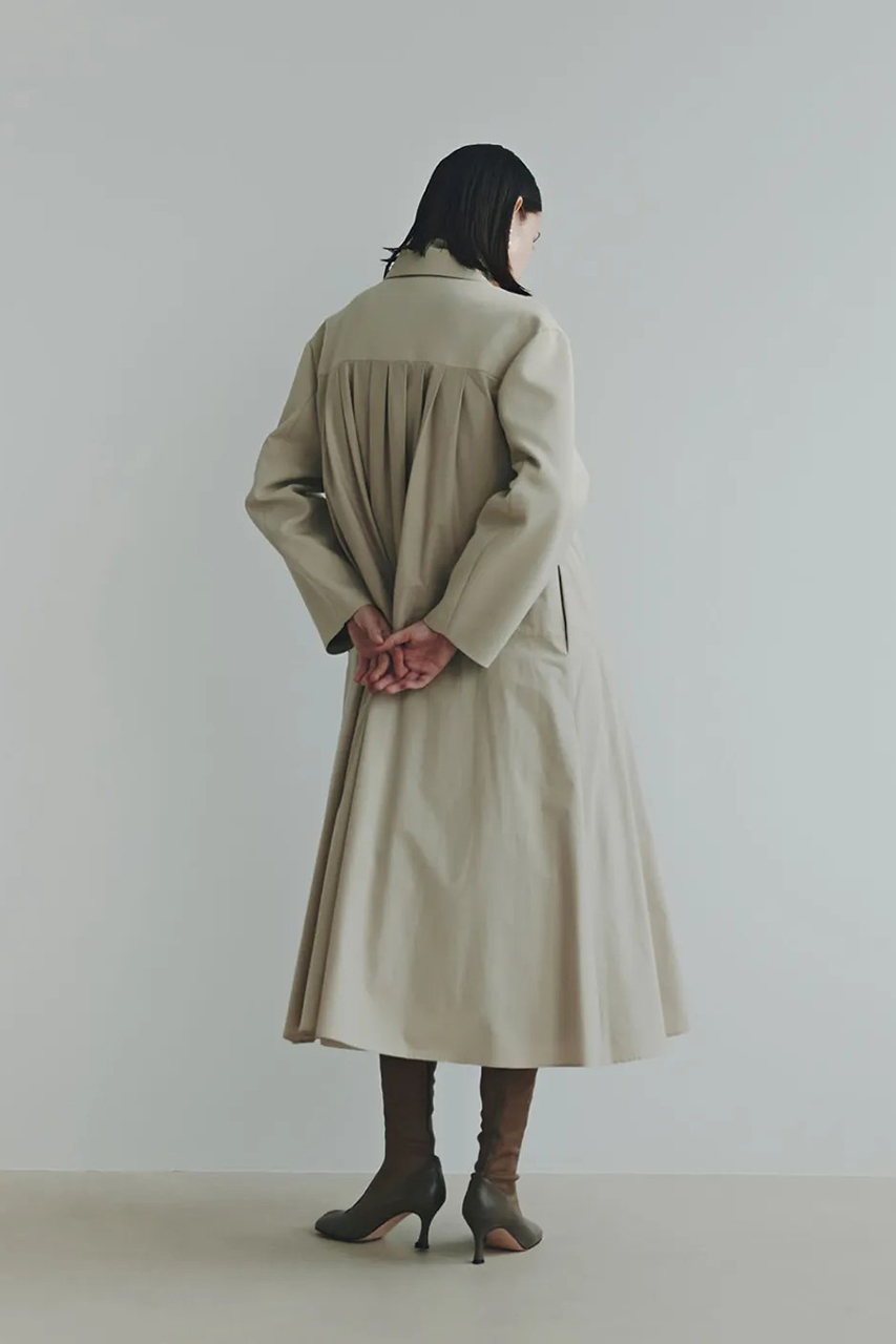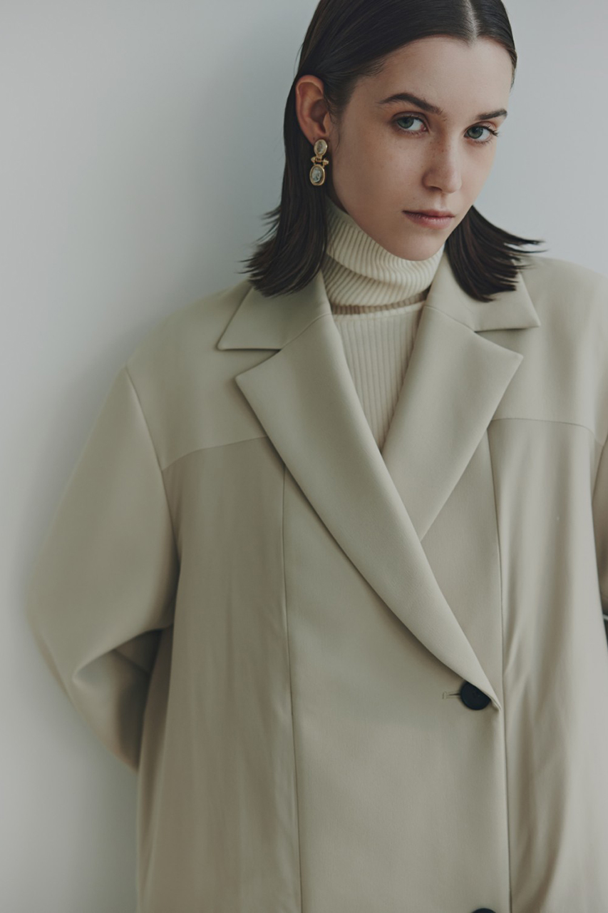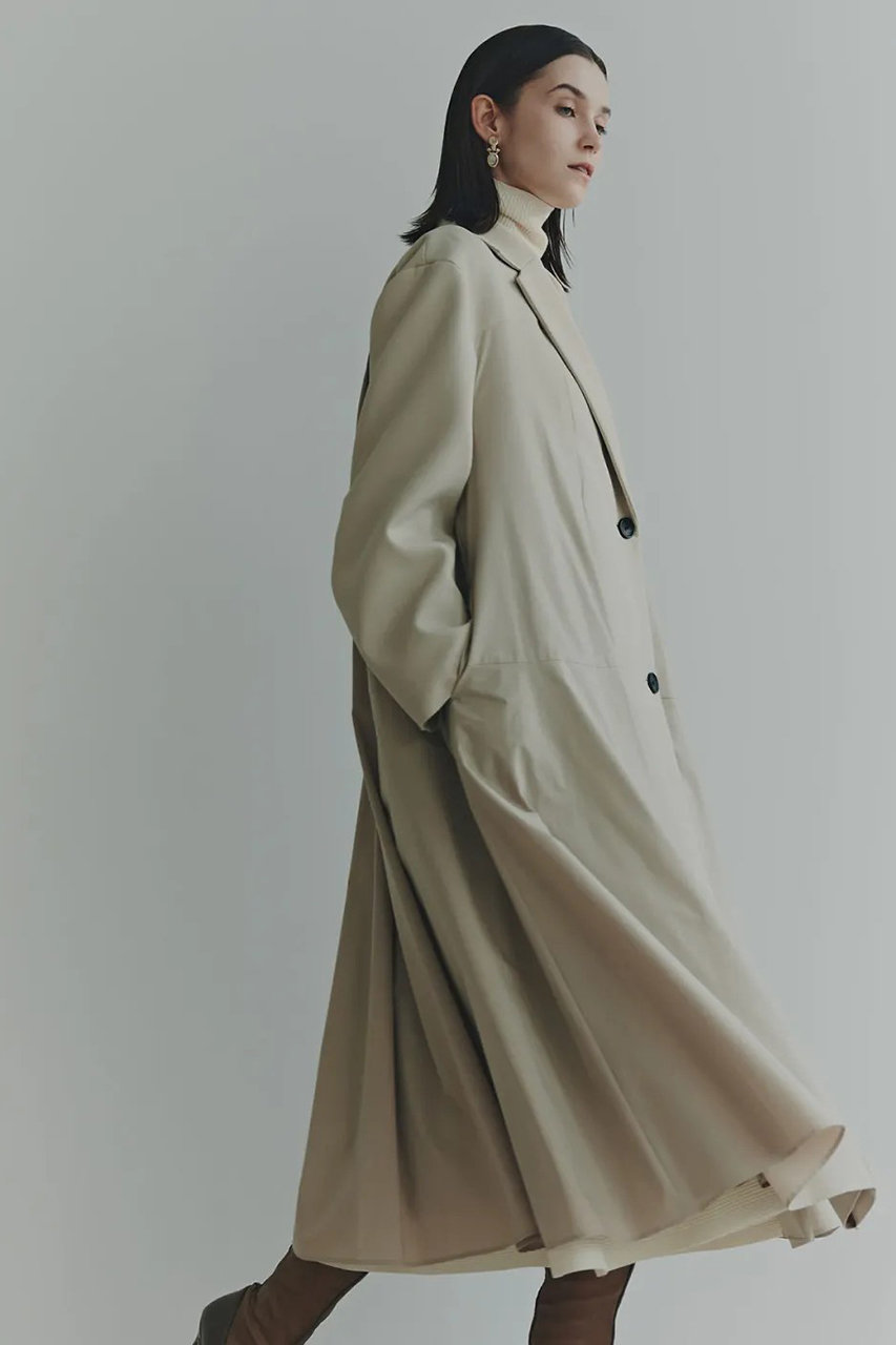 テーラードカラーでマニッシュな雰囲気を語るロングコート。三重織りとタフタのコンビネーションでラグジュアリーなボリューム感を出し、動くたびに優雅な趣きに。中綿のライナーは取り外しが可能なので、秋口には軽い羽織としても活躍してくれる重宝する1着。