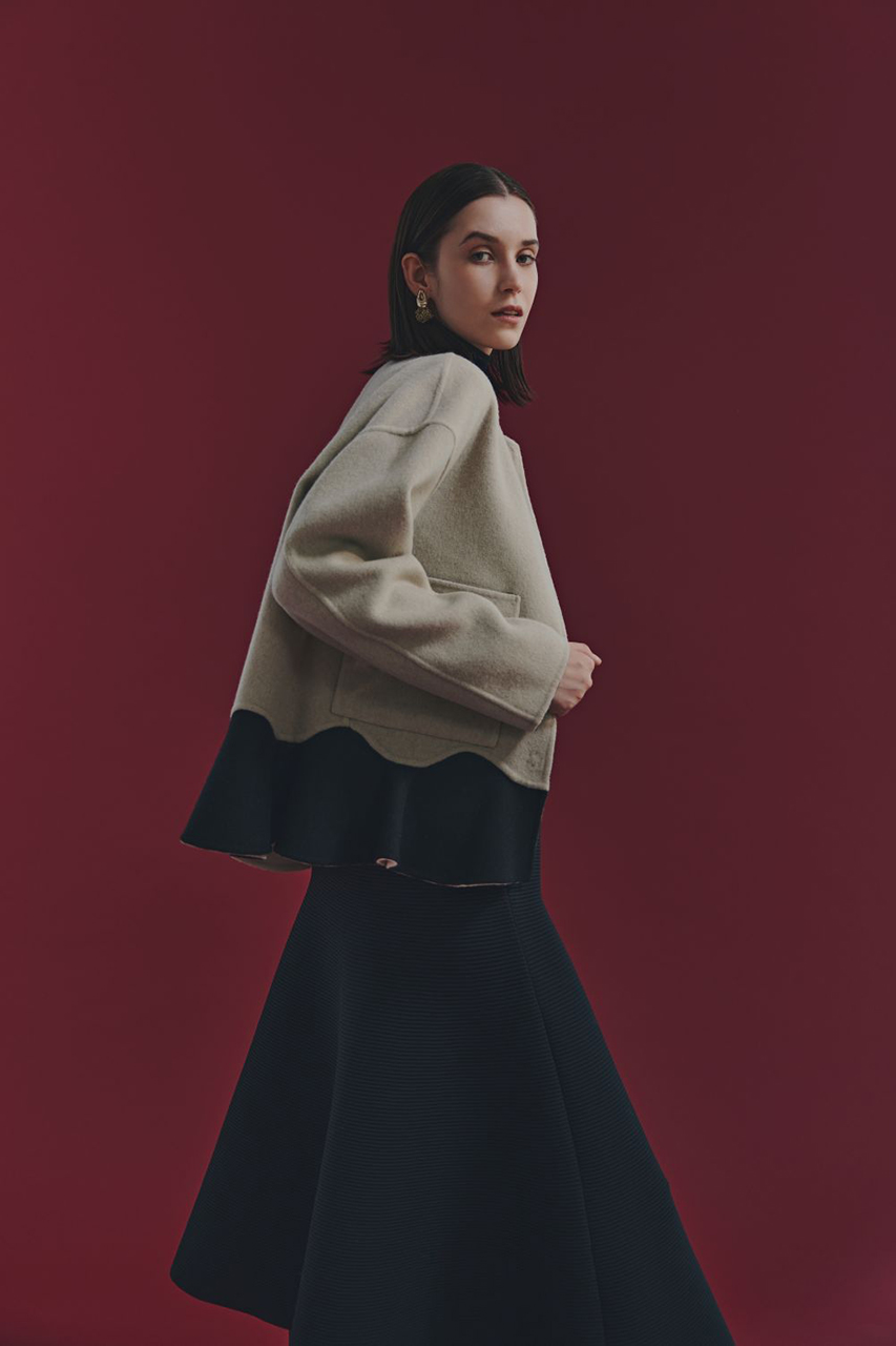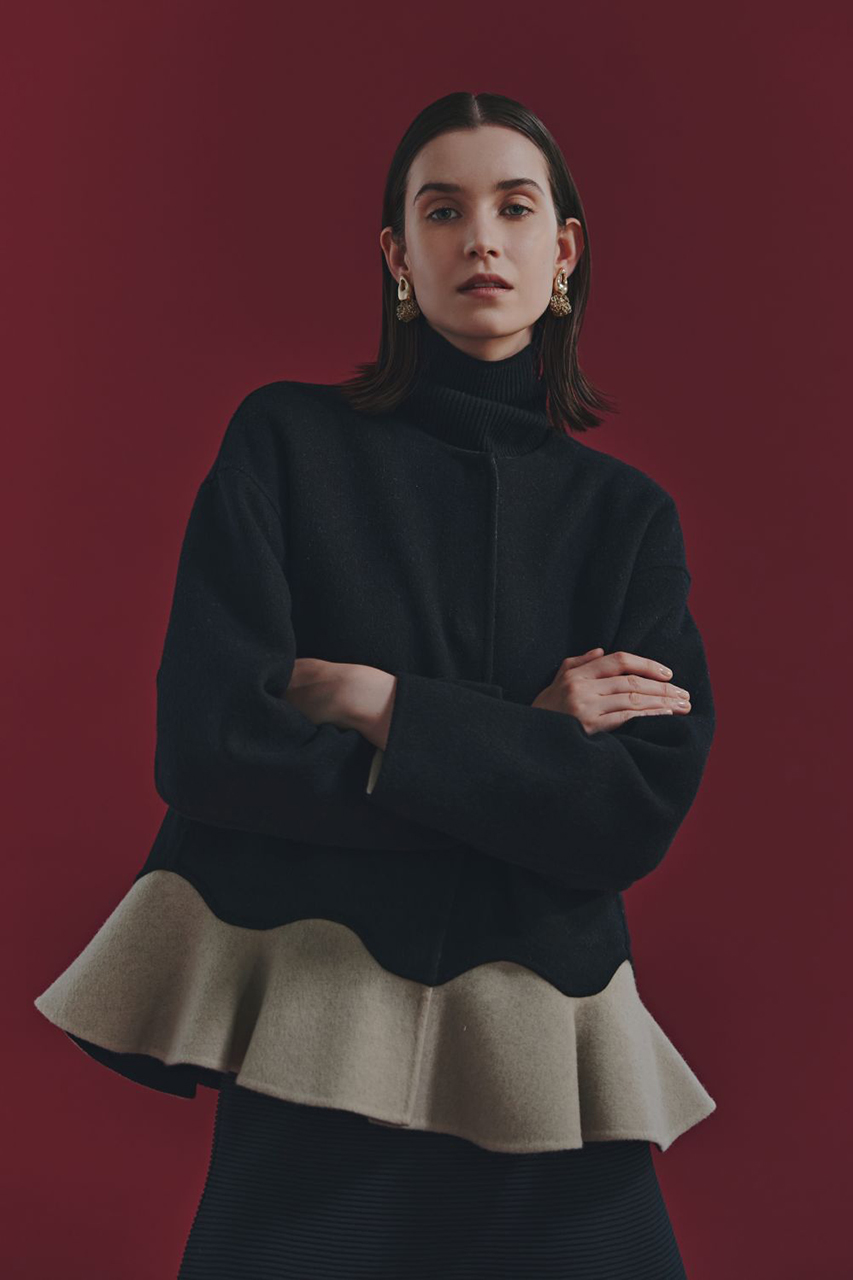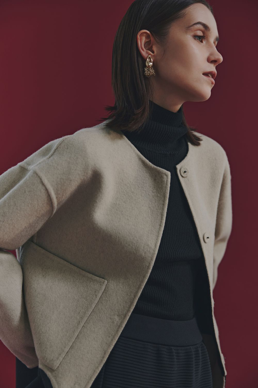 すっきりとしたノーカラーと、愛らしいペプラムがドッキングした女性らしいシルエットのジャケット。バイカラーであり、リバーシブルであり、カラーコンビネーションの面白さが着こなしの幅を広げてくれる。軽く起毛したファブリックで、季節を感じられるあたたかな着こなしへ。