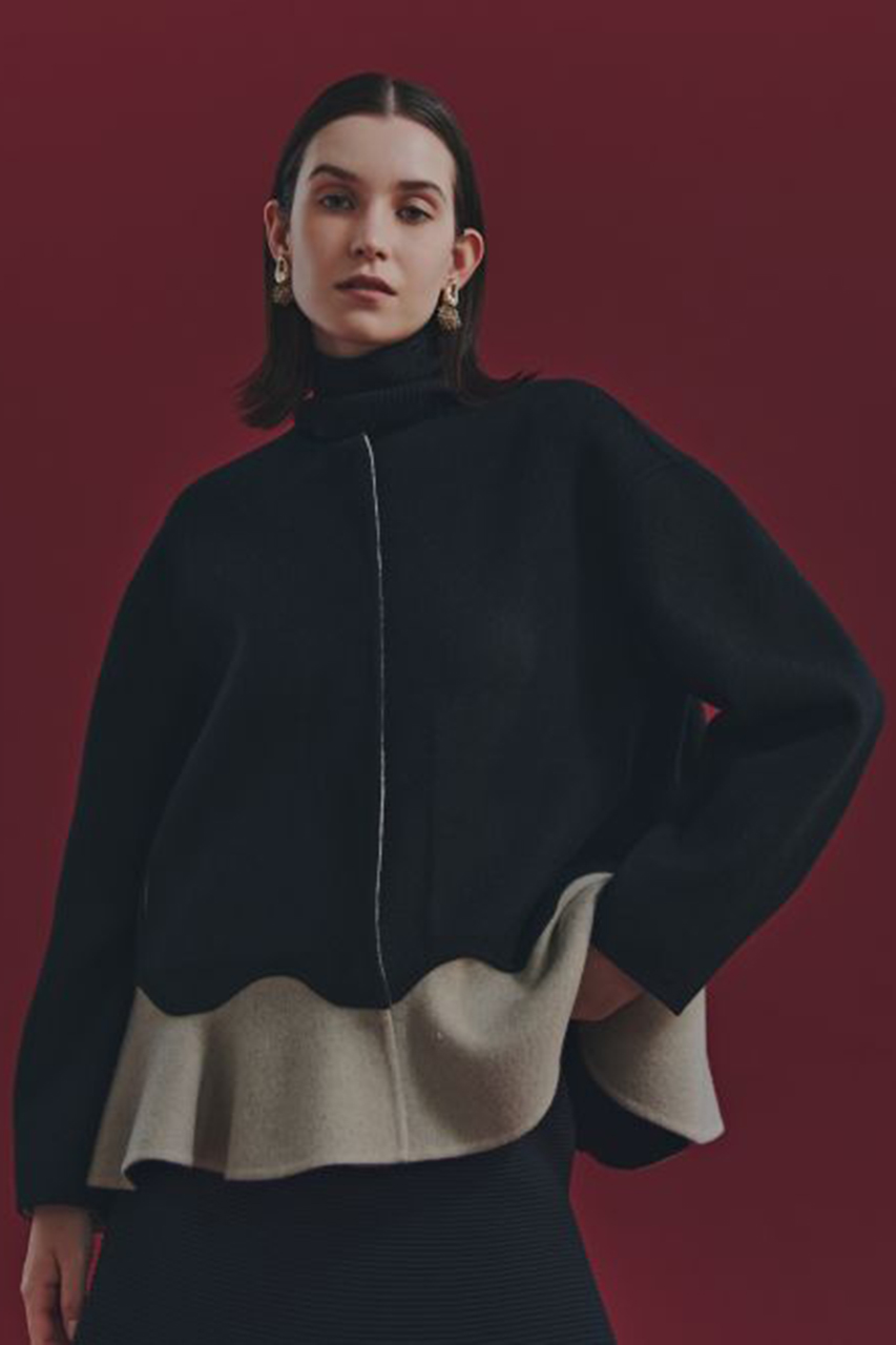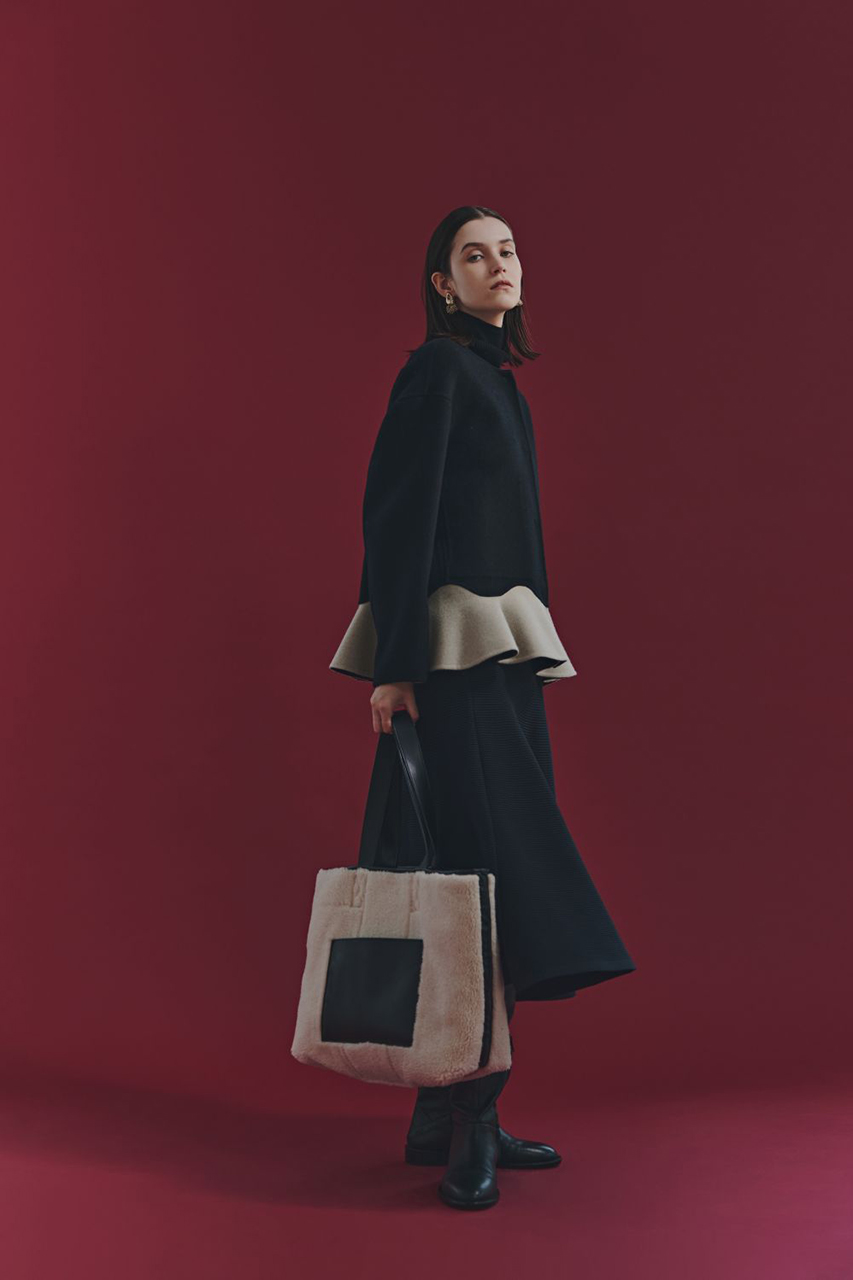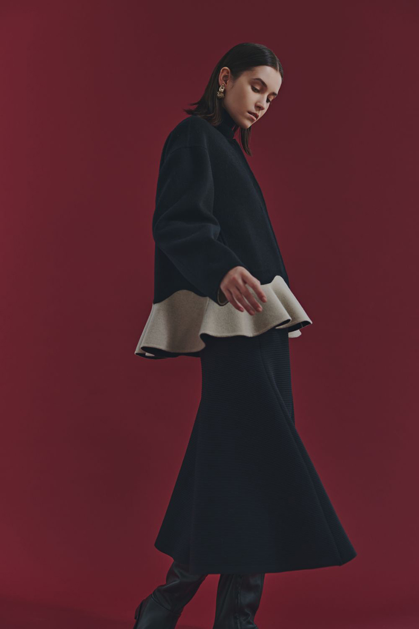 すっきりとしたノーカラーと、愛らしいペプラムがドッキングした女性らしいシルエットのジャケット。バイカラーであり、リバーシブルであり、カラーコンビネーションの面白さが着こなしの幅を広げてくれる。軽く起毛したファブリックで、季節を感じられるあたたかな着こなしへ。