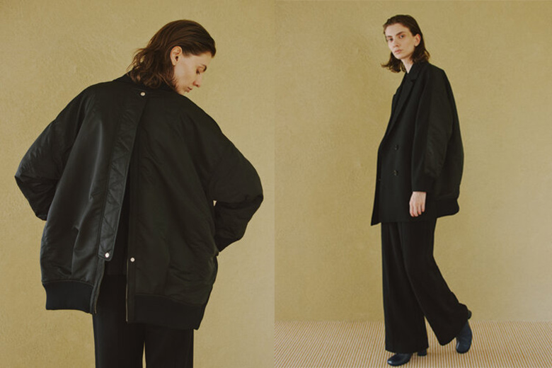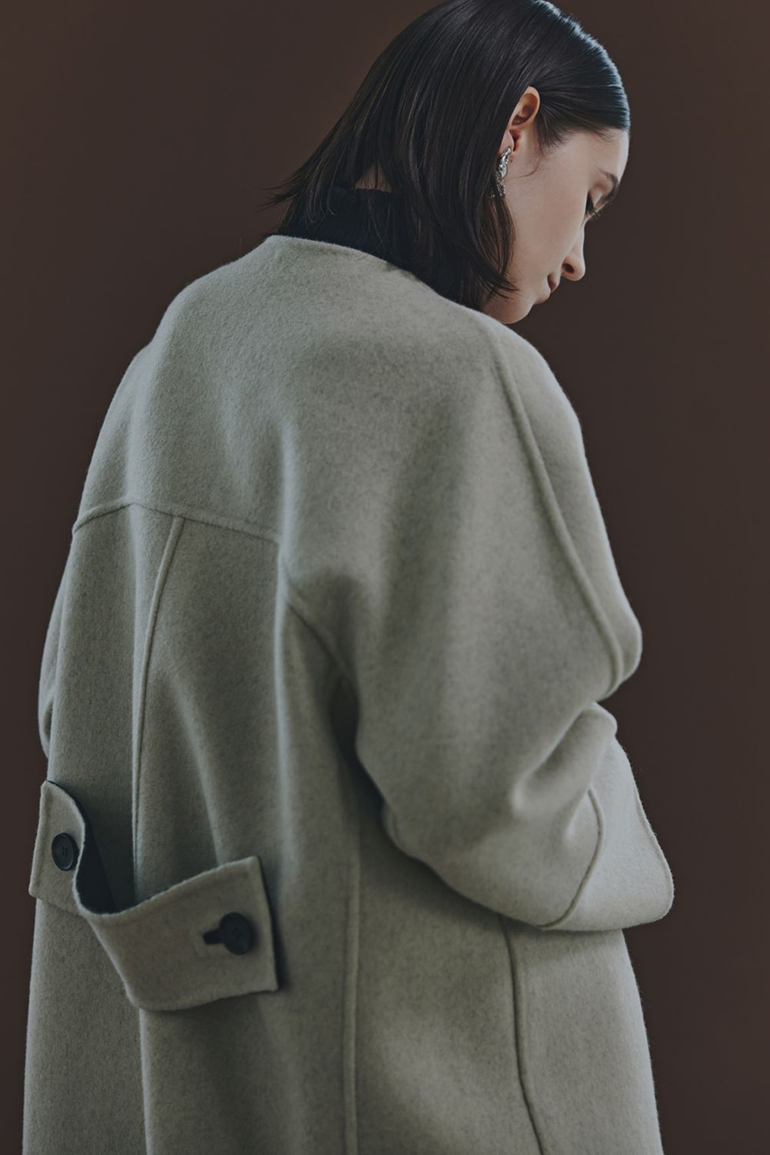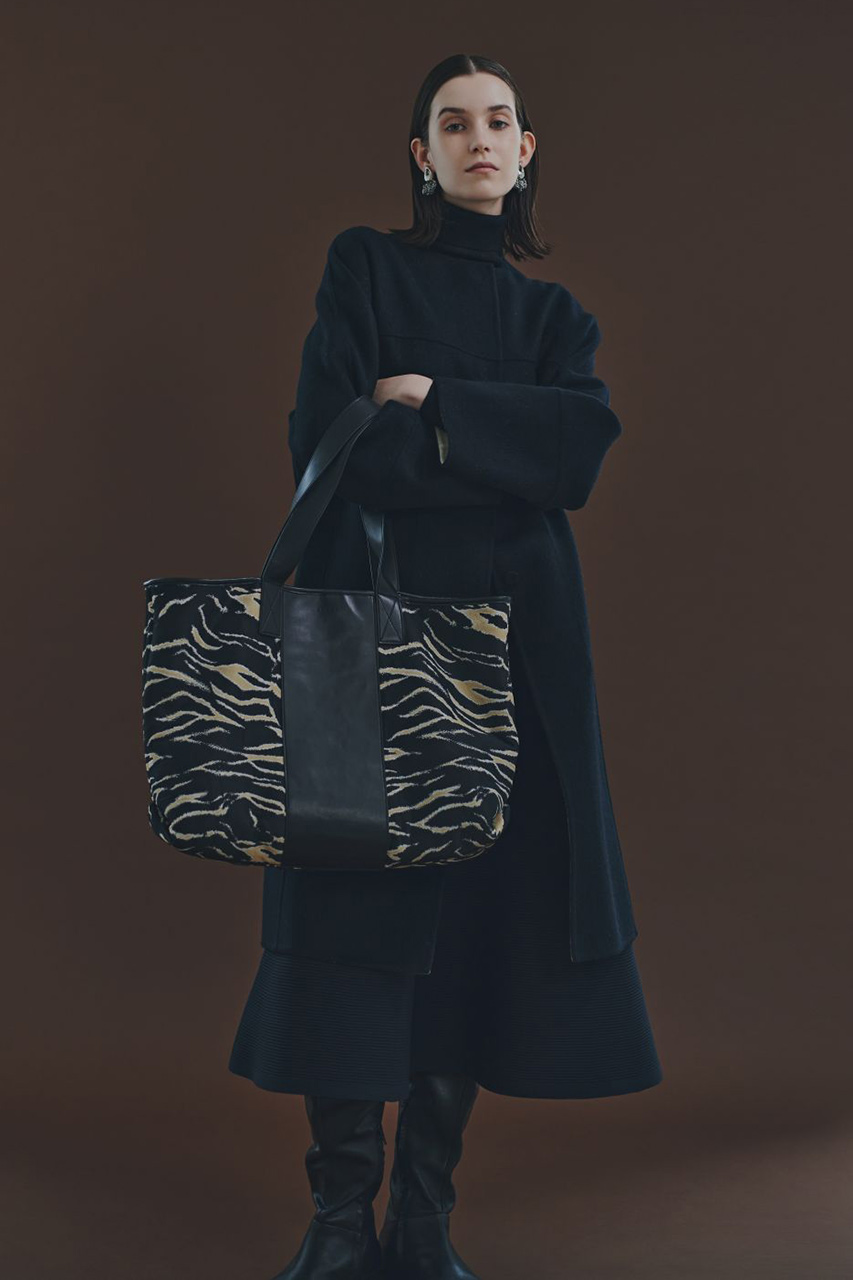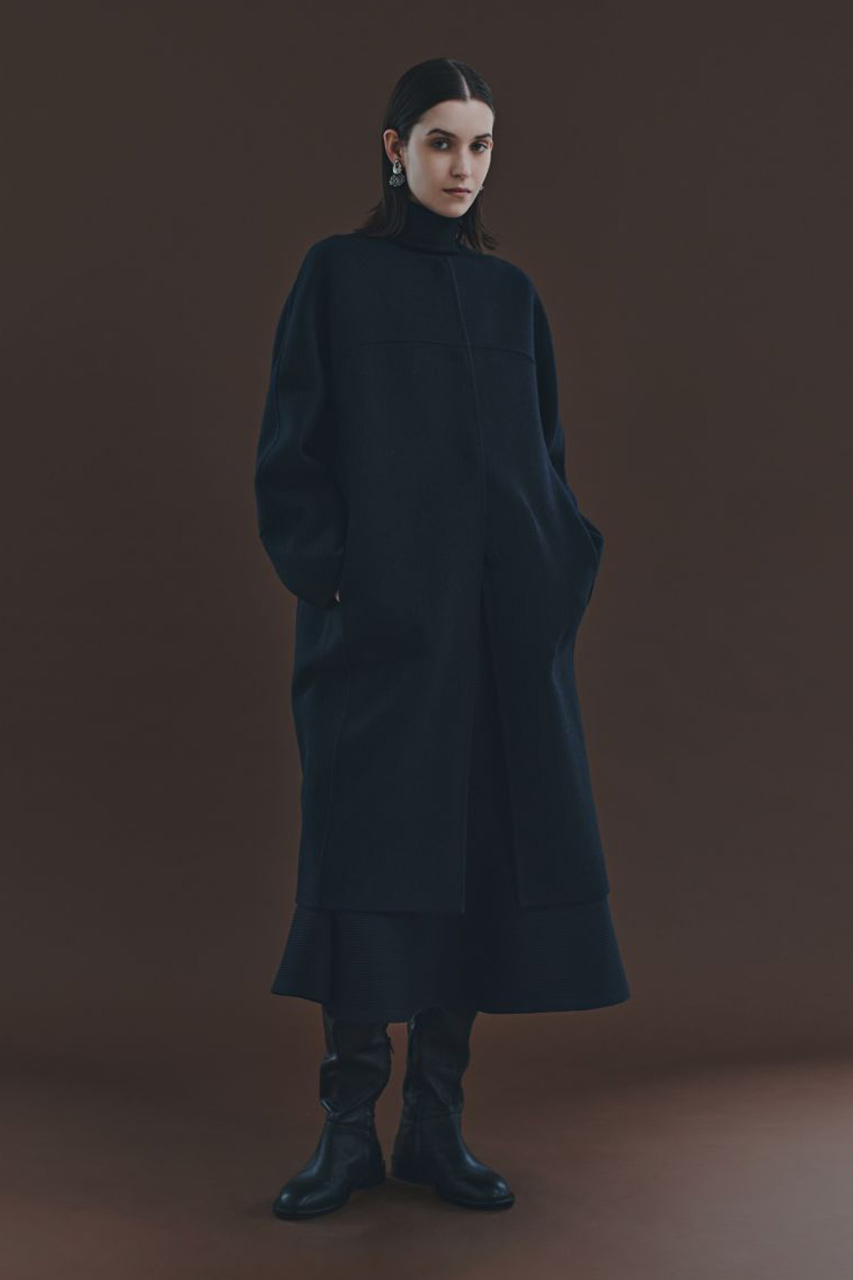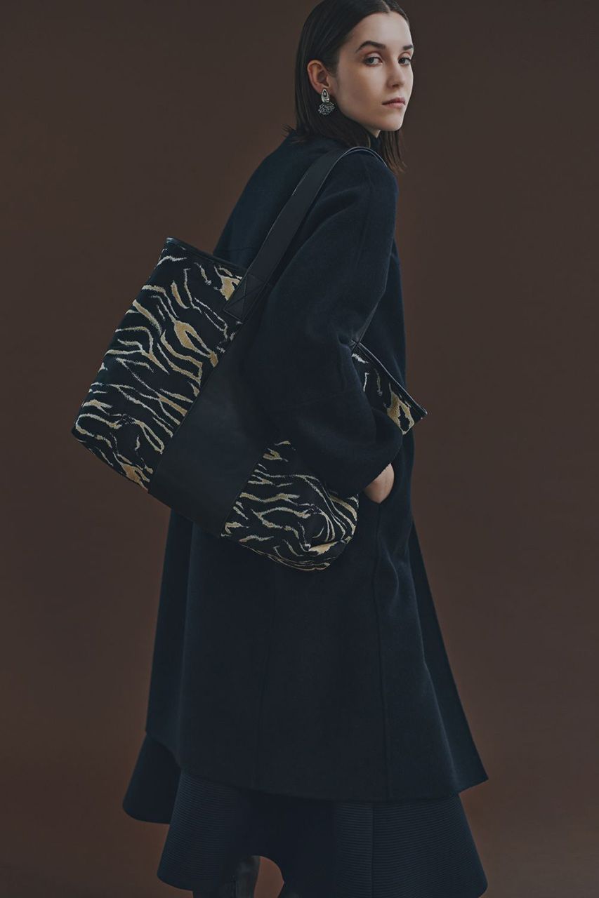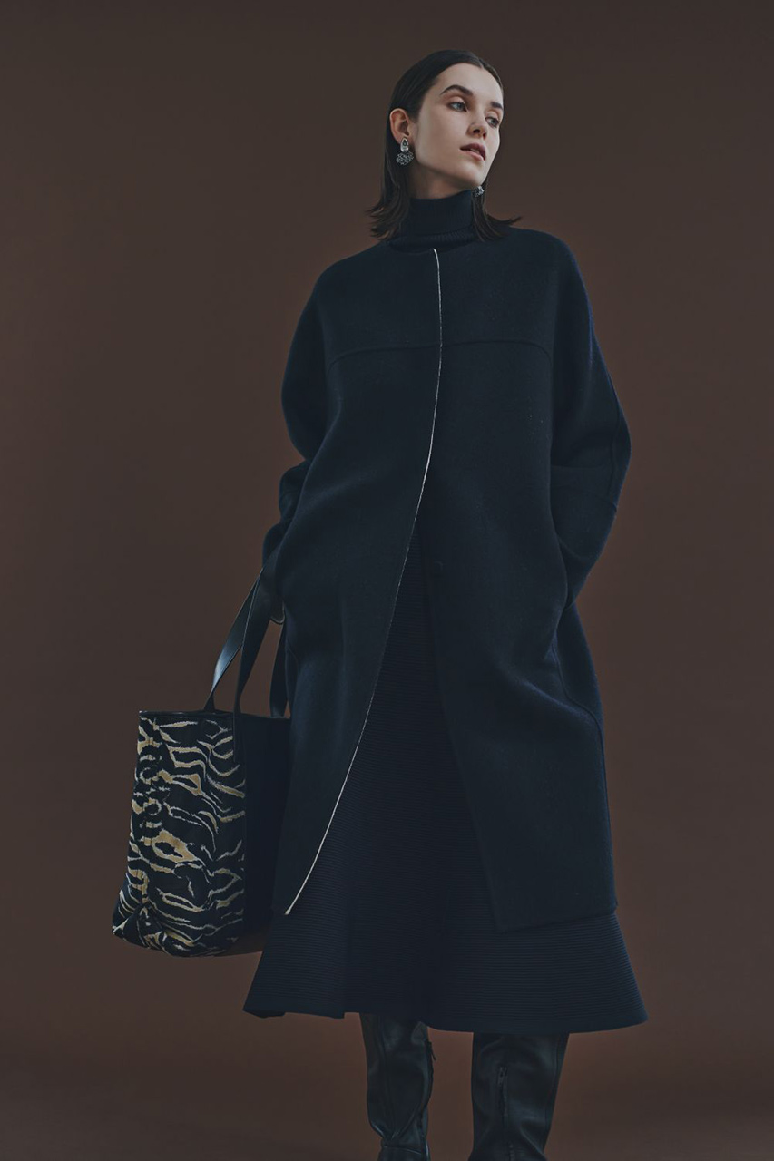 ADOREのアーカイブからピックアップされたリバーコート。胸元の切り替えから続く袖のデザインが、肩のラインを美しく見せる。ブラック×ベージュのシンプルなカラーに、バックスタイルや大きなベルトがアクセントになりノーブルな着こなしに個性を添える。