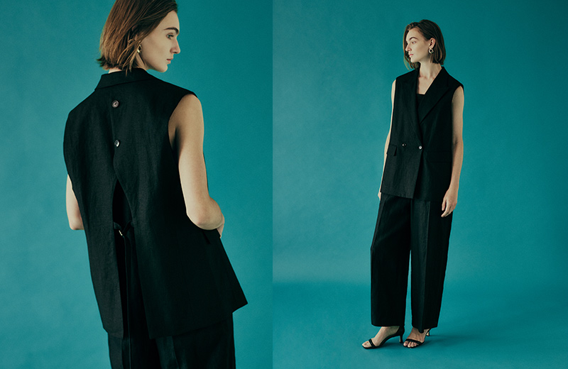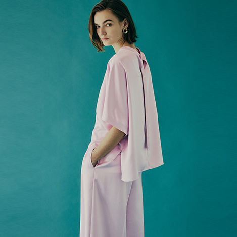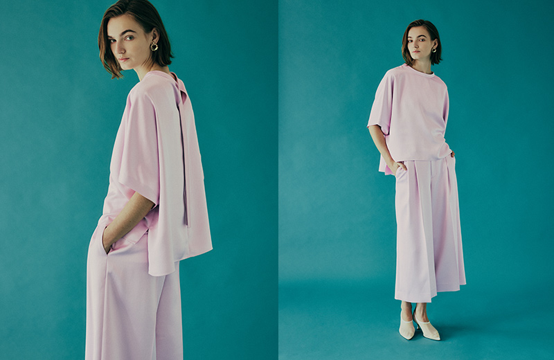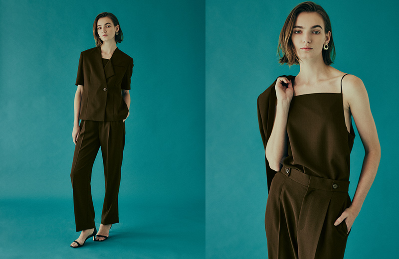 さらりとしたタッチとしなやかさを持つドライツイルジャケットとキャミソールブラウスとパンツのセットアップスタイル。