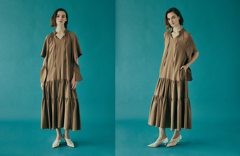 ティアードデザインのドレスで長めのリボン調デザインやネック部分のギャザーもポイントです。