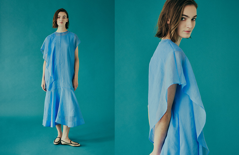 経糸に張り感とちらちらとした光沢のある極細ポリエステル割線糸を使用し、ソフトでふくらみのあるセルロース糸をヨコに交織させることにより、適度な張感がありながらも、薄くソフトで軽く仕上げた素材で仕立てました。