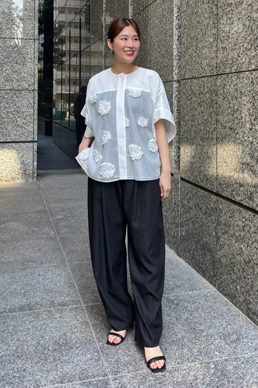 トップスはフラワー刺繍が華やかで、1枚で着映えするデザイン。