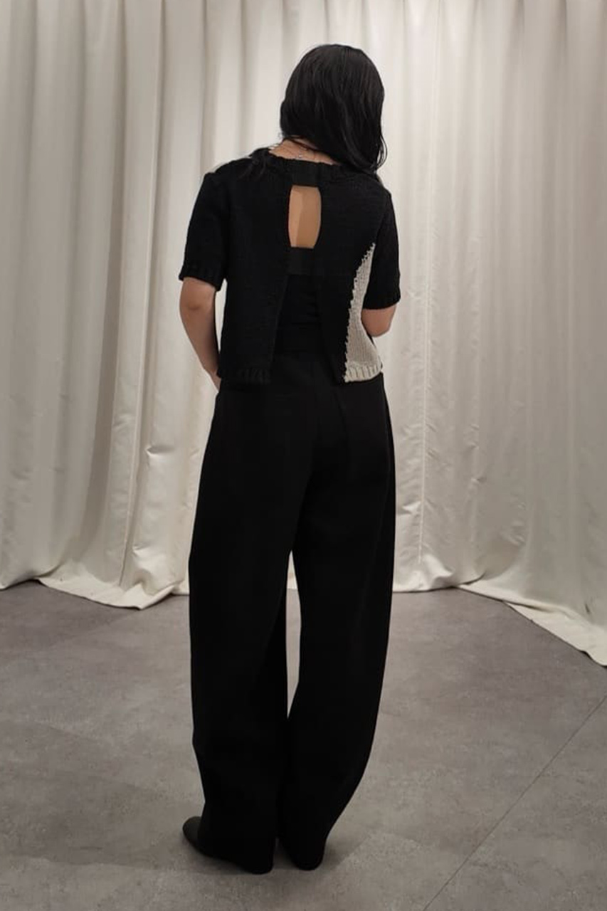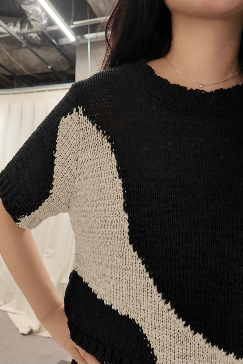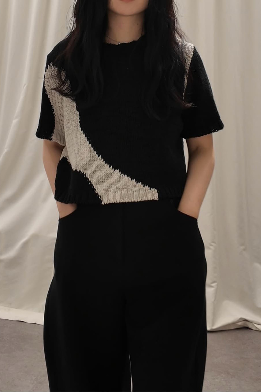 アブストラクトな柄が目を惹くショート丈ニットと、合繊インナーがセットになったアイテムです。