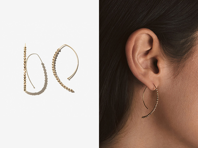 バナナフープピアスは14Kゴールドのカットビーズが角度によって繊細に煌めきます。上品で洗練された輝きは、日常から特別なシーンまで幅広く活躍。中でも使いやすいSサイズは、ホリデーギフトとして喜ばれること間違いなしのジュエリーです。