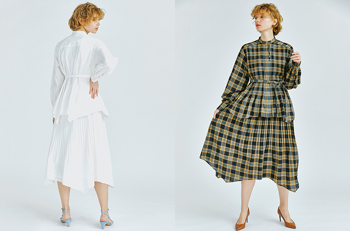 細やかなプリーツにイレギュラーヘムのディティールが軽やかなブロードプリーツのセットアップ。並んだ包みボタンや、つまったネックデザイン、ふくらみのある袖のディティール、動くたびに表情を変えるスカートのひらめきなど、クラシカルさとカジュアルさの両面を併せもつ、「ランバン オン ブルー」らしい華やかな印象のブラウスとスカートです。