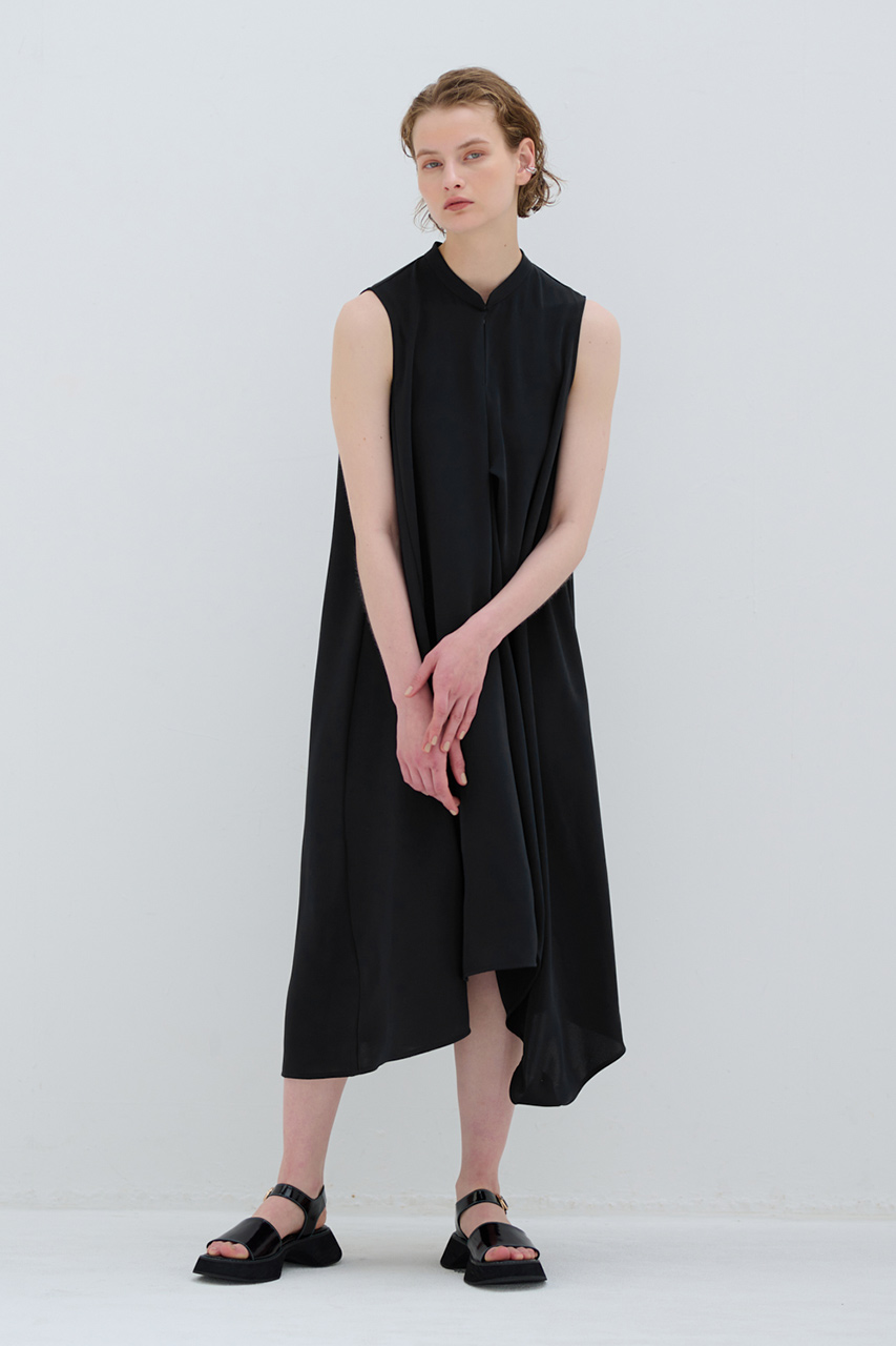 働く女性をイメージしたワンピースは、ちょっとかしこまりたい様々なシーンに適応します。アシンメトリーなデザインが抜け感と軽やかさ、また柔らかさを表現。ウォッシャブルでシワになりにくく、乾きやすい生地を使用しているため、デイリーに大活躍。