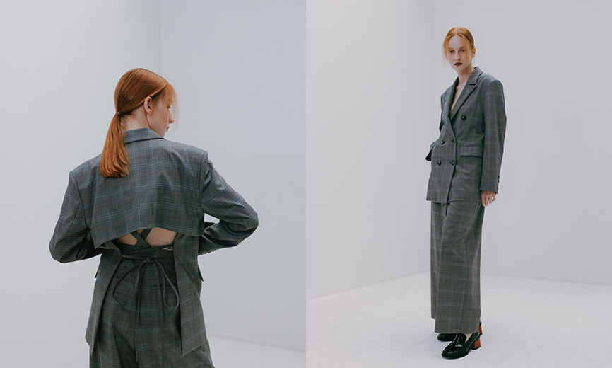 秋冬モードを一気に加速するグレンチェックのテーラードスタイル。クラシカルなディティールに相反した、大胆なバックレスデザインが魅力的。さっと羽織るだけでこなれ感のある着こなしが完成します。