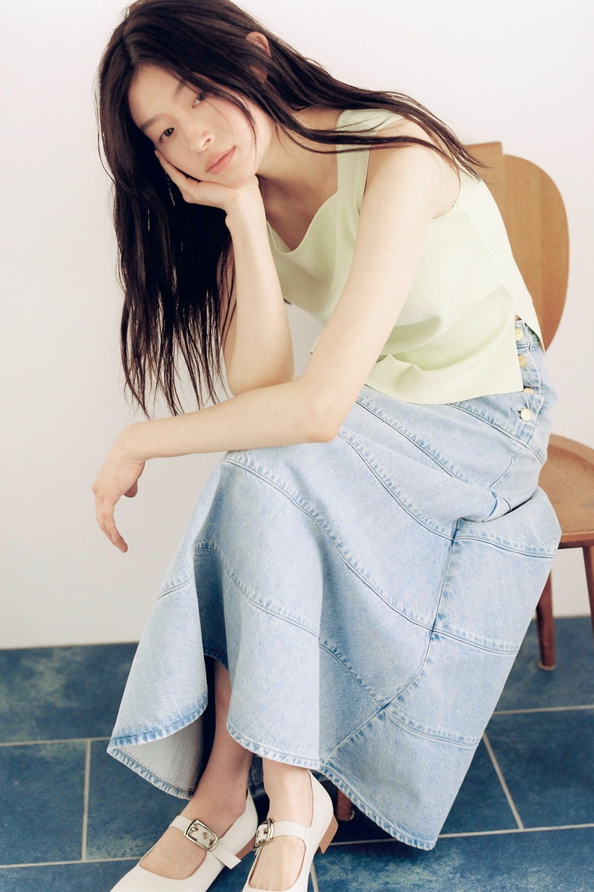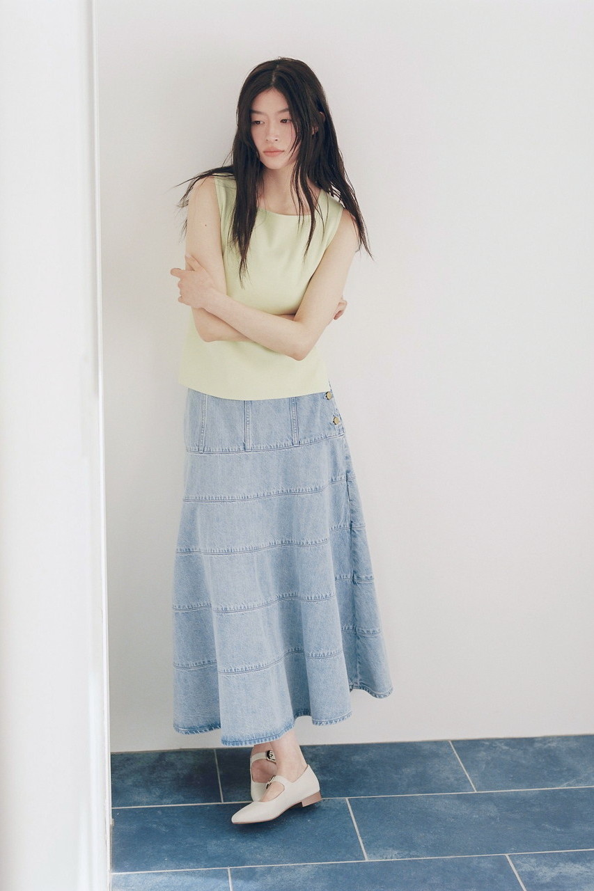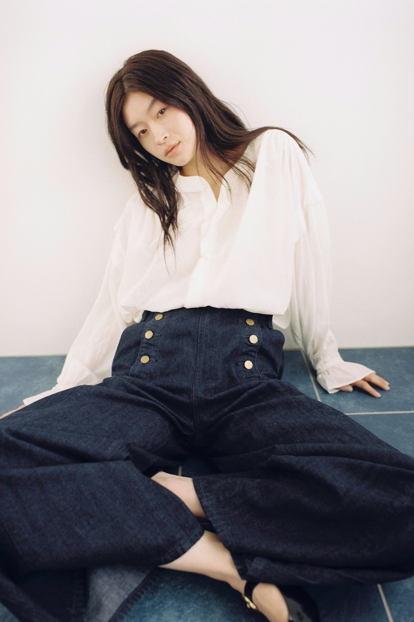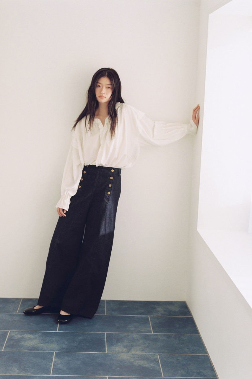 ウエストのデザインが特徴的なデニムパンツには、柔らかくしなやかな素材のブラウスをIN。