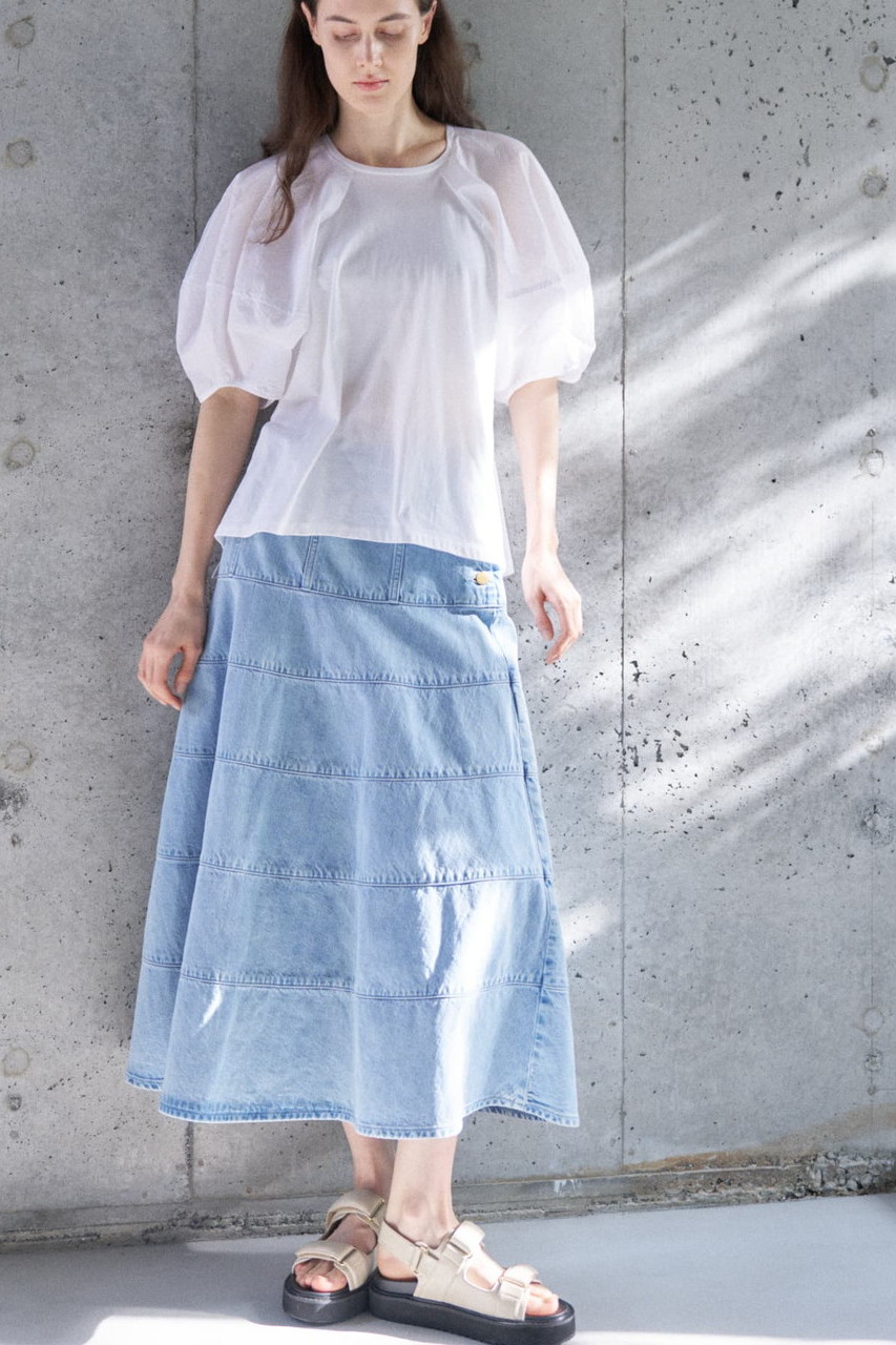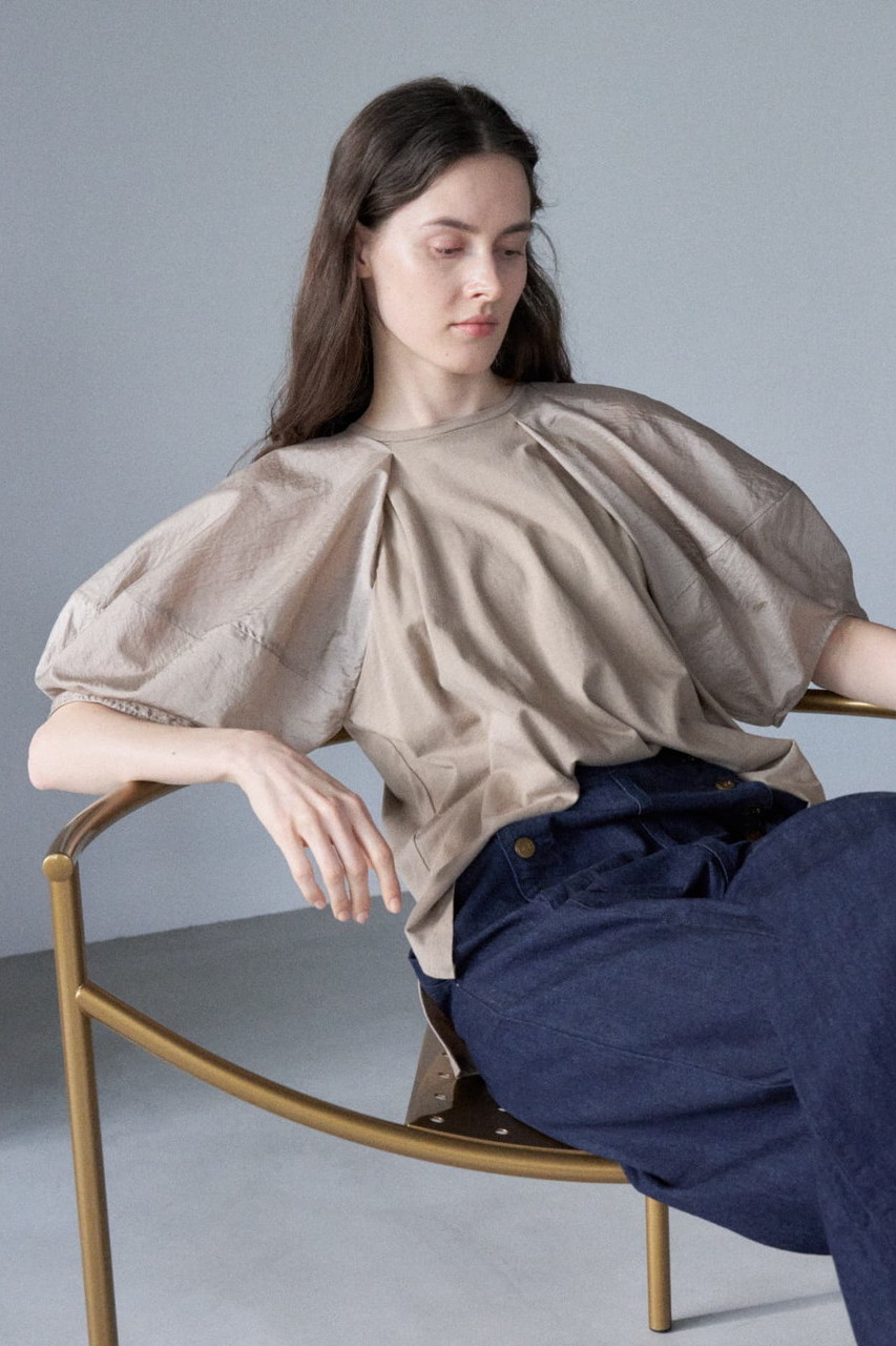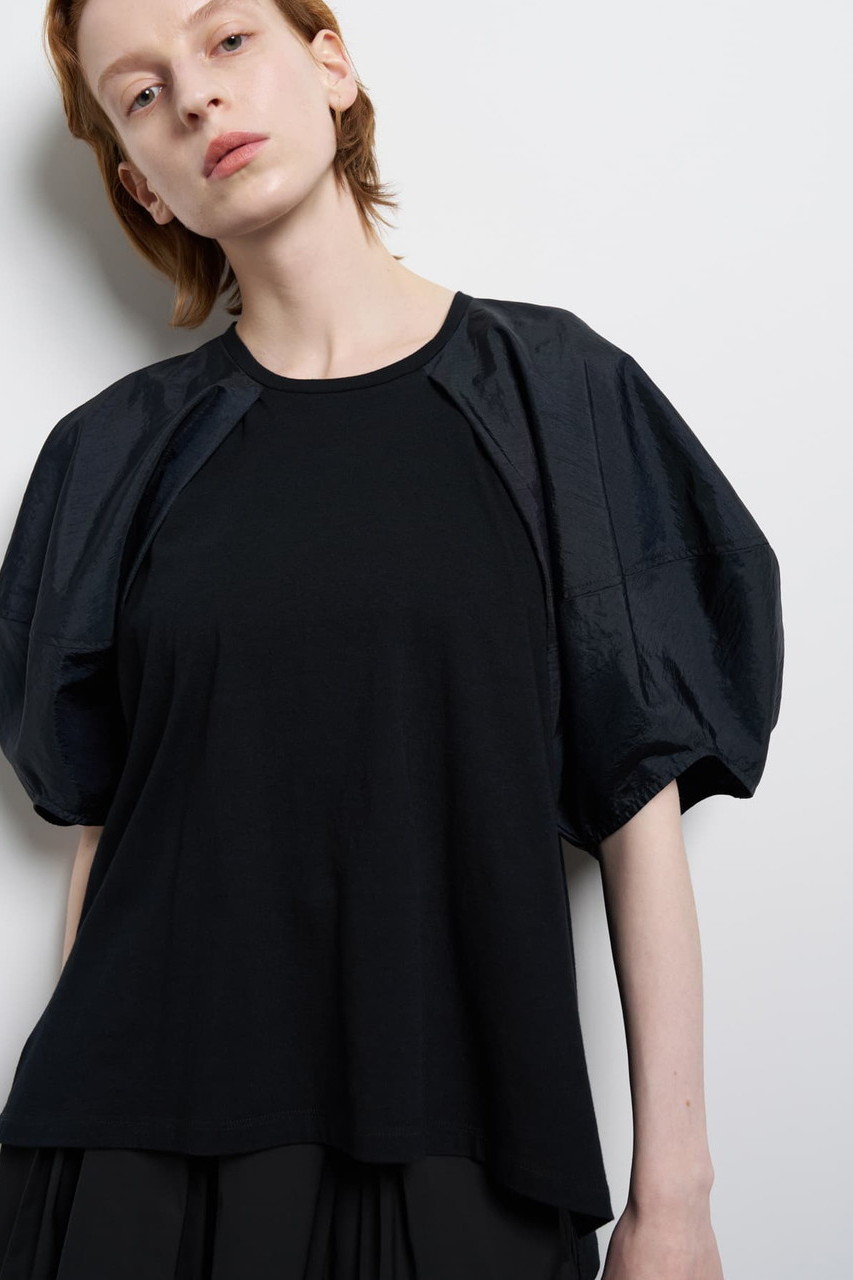 ほのかな光沢感のあるタフタ素材と柔らかなコットン素材の異素材コンビカットソーは、Tシャツのような着心地とブラウスのようなデザイン性を兼ね備えたアイテム。デニムスのインナーに仕込めば袖のデザインとのレイヤードが楽しめます。