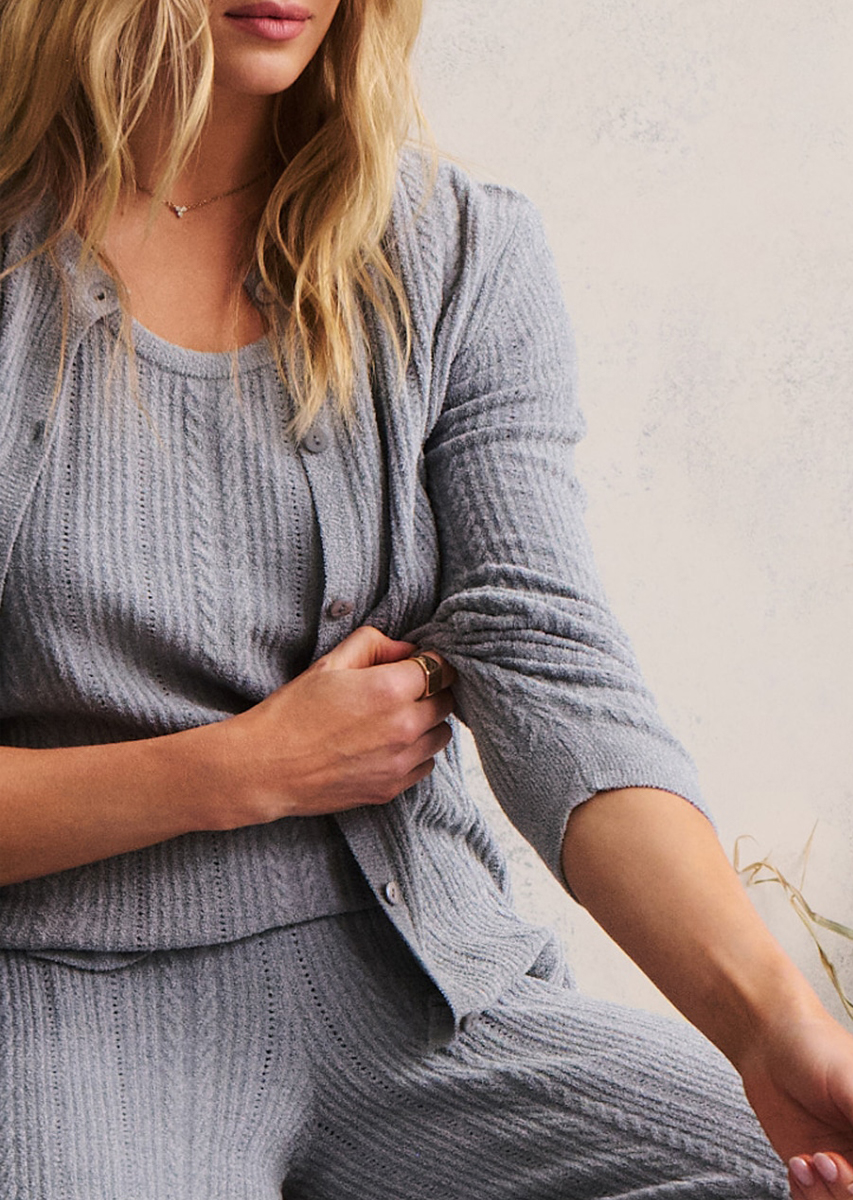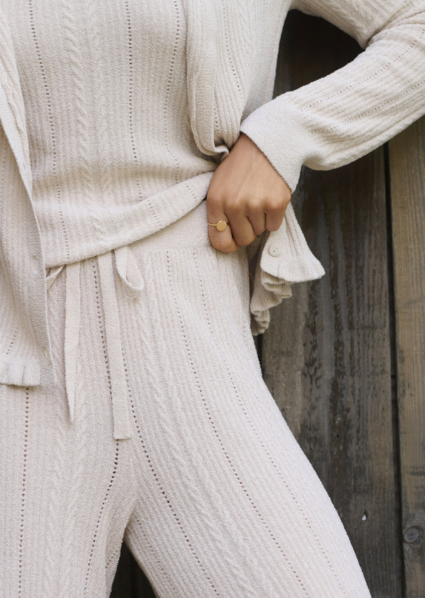 おうち時間にも、ちょっとしたお出かけにも映える、「ベアフット ドリームズ」の洗練されたスタイルのある着こなし。立体感のあるケーブル編みとフェミニンなリブ編み、表情の異なる2シリーズをご紹介します。