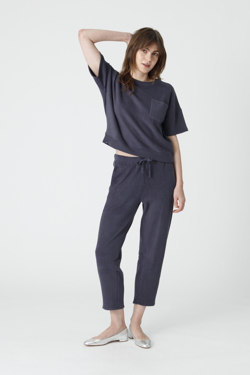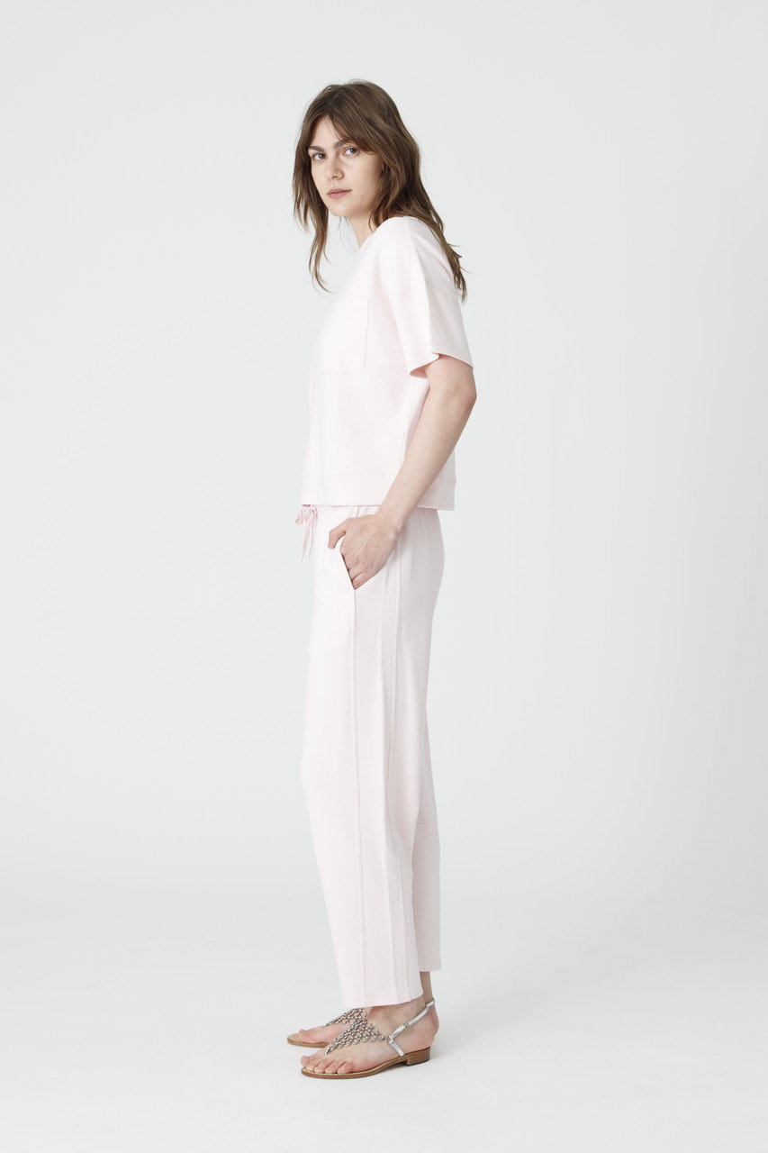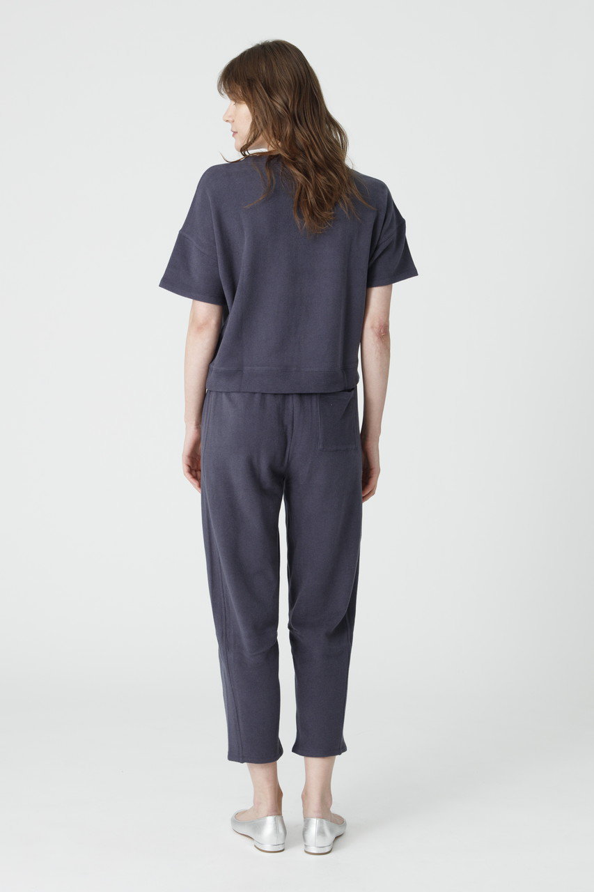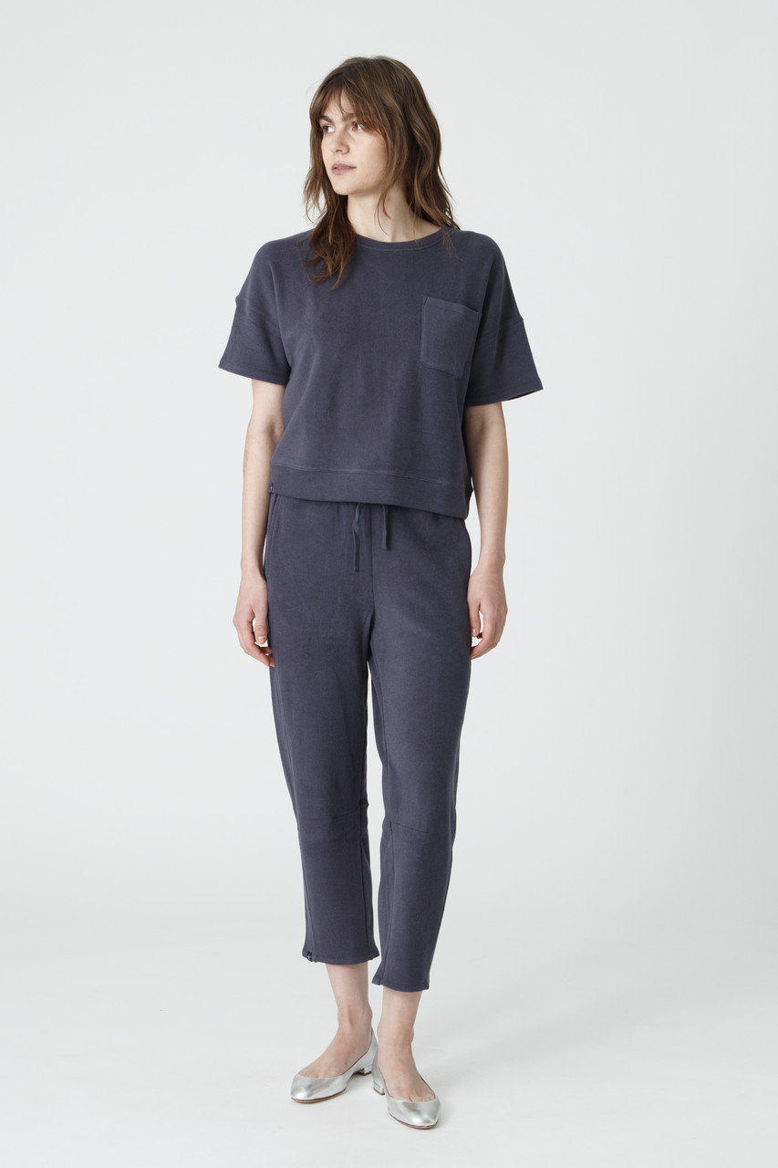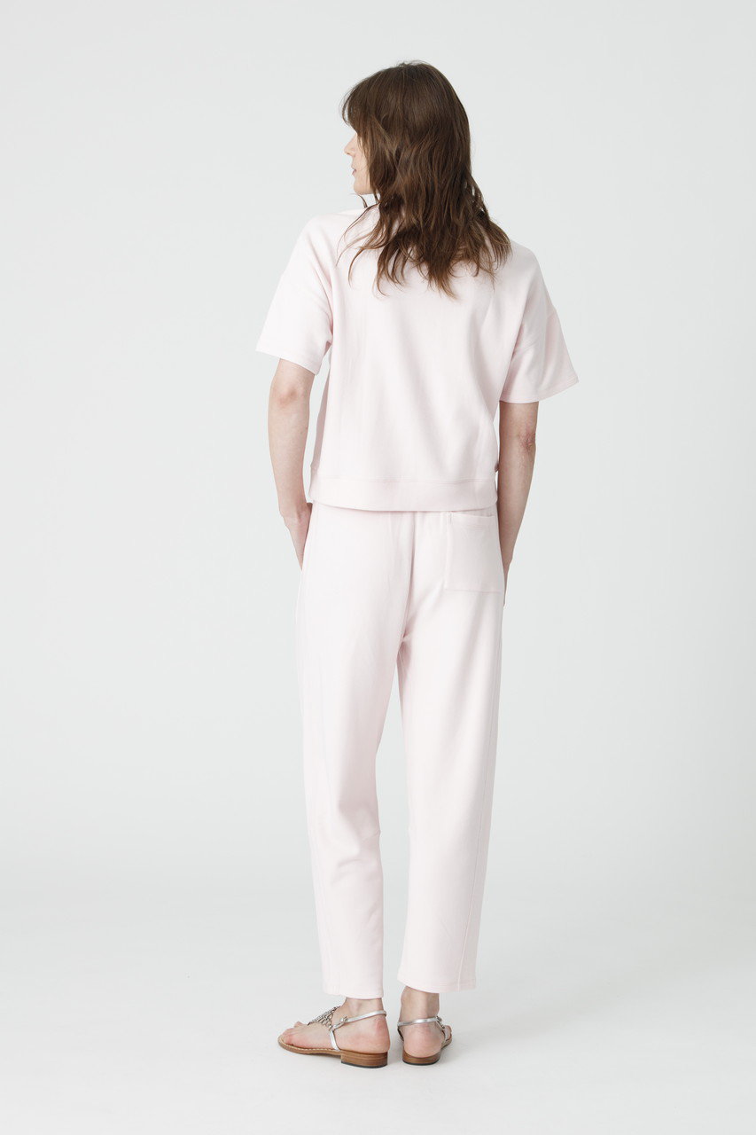 驚くほど軽やかでとろけるような肌触りのブラッシュドフリースを使用したセットアップ。トップスはドロップショルダーのゆったりとしたシルエットが今っぽい表情に。ボトムは足首をすっきりと見せてくれるアンクル丈で、センターシームが縦のラインを強調し、スタイルアップを叶えます。ルームウェアの枠を超えた洗練されたルックスは、ワンマイルのお出かけやご旅行時の機内着にも最適です。