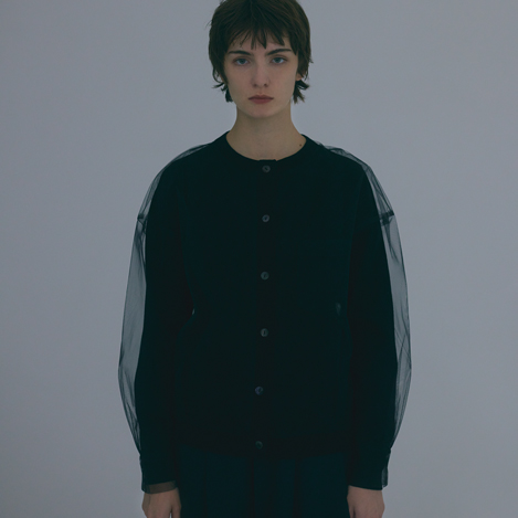 チュール素材から透けて見えるニットカーディガンが何とも上品な1枚で、フェミニンな柔らかい表情がコーディネートを華やかにしてくれること間違いなし。チュールで包むことによって、ボディラインが曖昧になるため、実はスタイルアップ効果にも期待! フロントボタンを閉めてプルオーバーとしての着用もおすすめです。