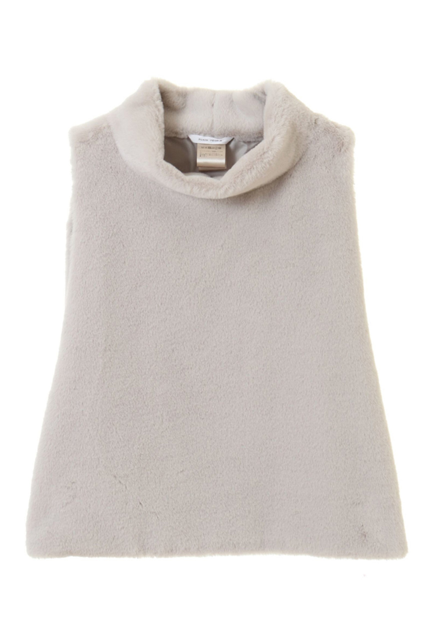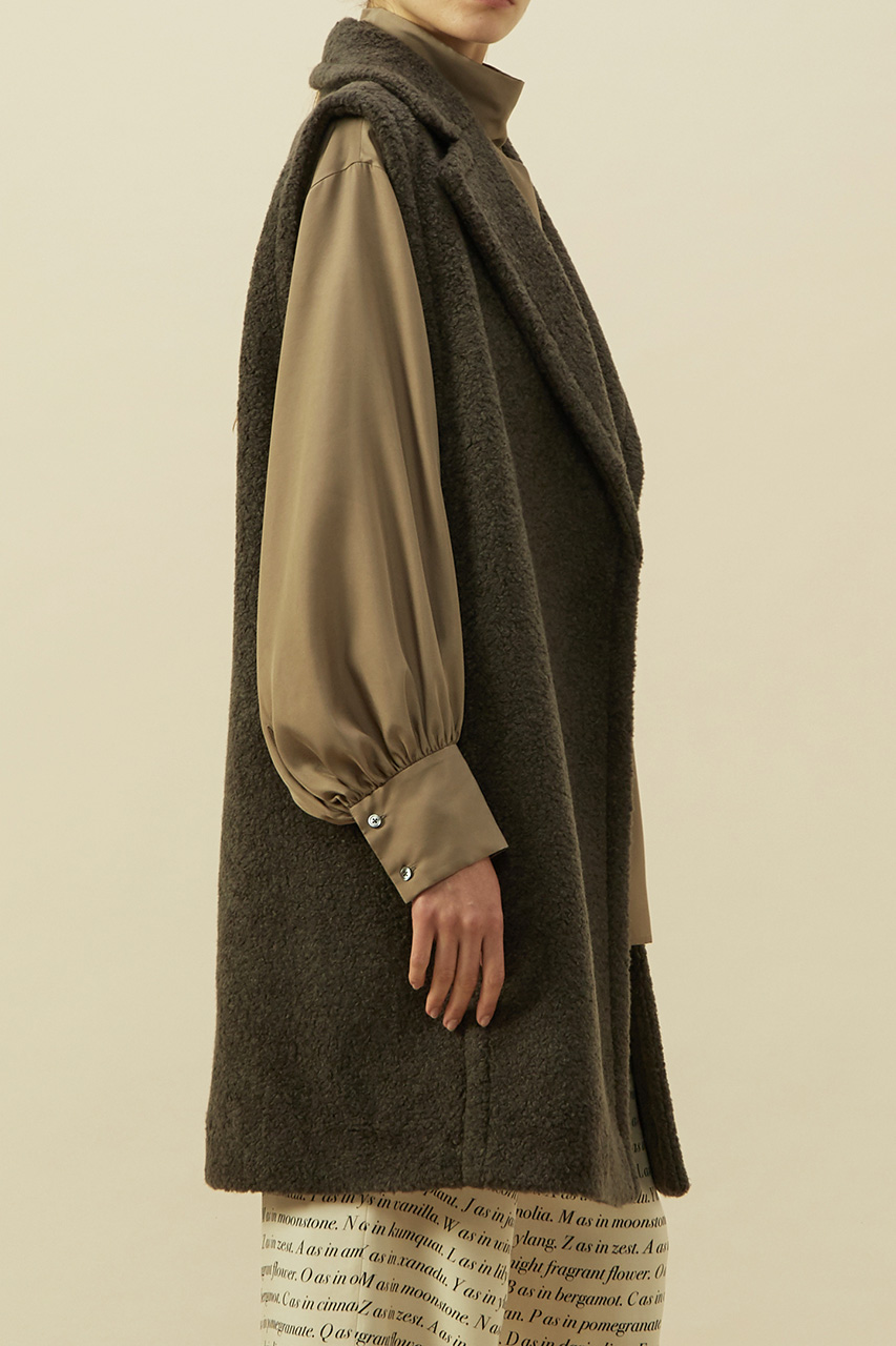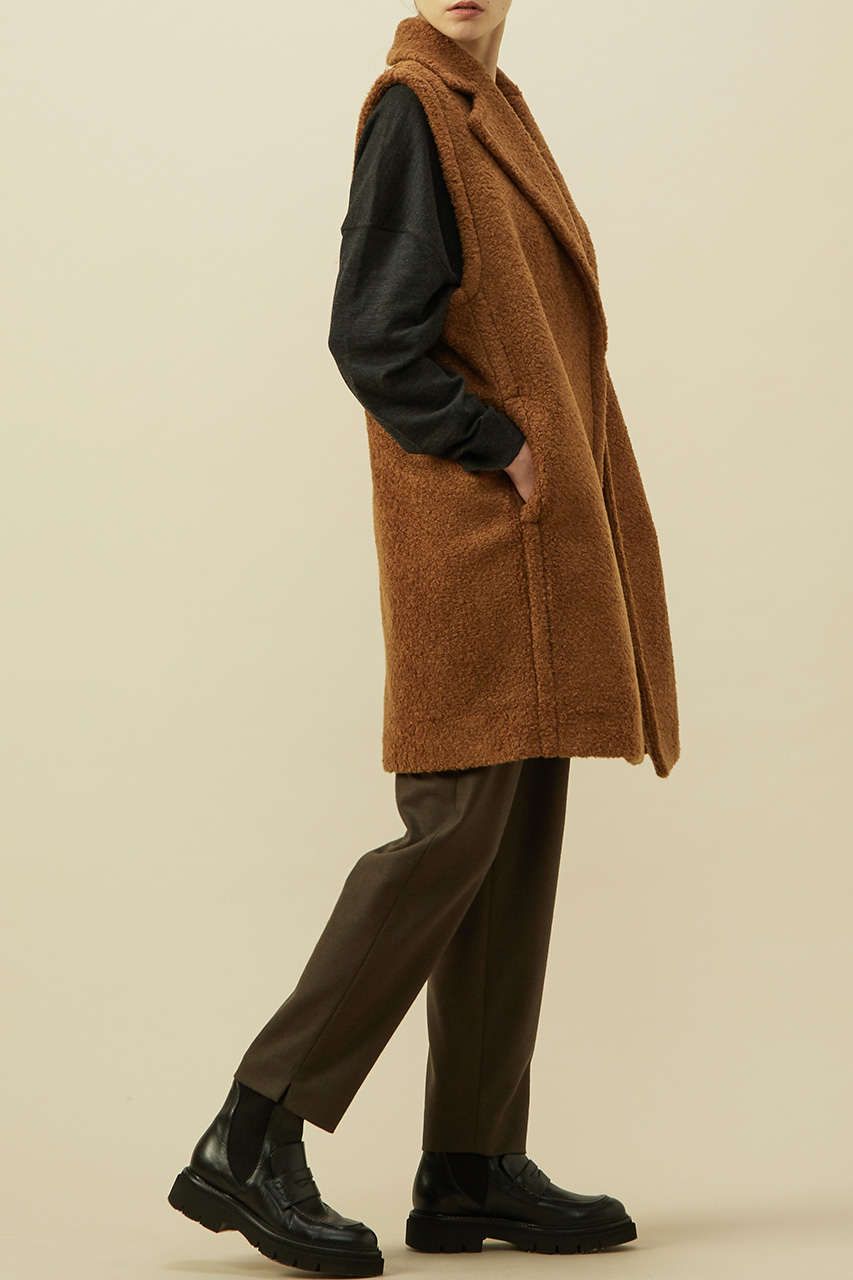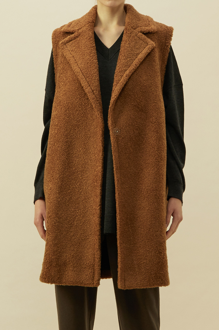もこもこしたボリュームのあるシープボアは、リアルウールの艶感と滑らかな手触りが特徴です。デザインは、ノースリーブでボリュームを抑えたシャープな印象です。