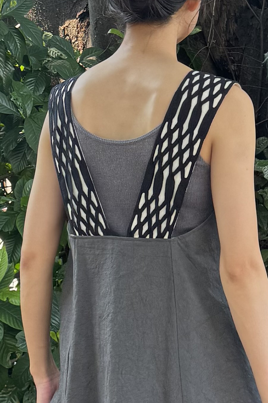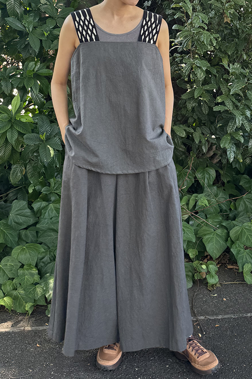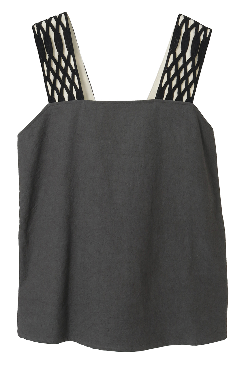 オリジナルのレースをアクセサリーのように着るアイテム。身頃のキャンパス地と同じ生地をつかったパンツとのセットアップでは、甘さを抑えたコーディネートに。