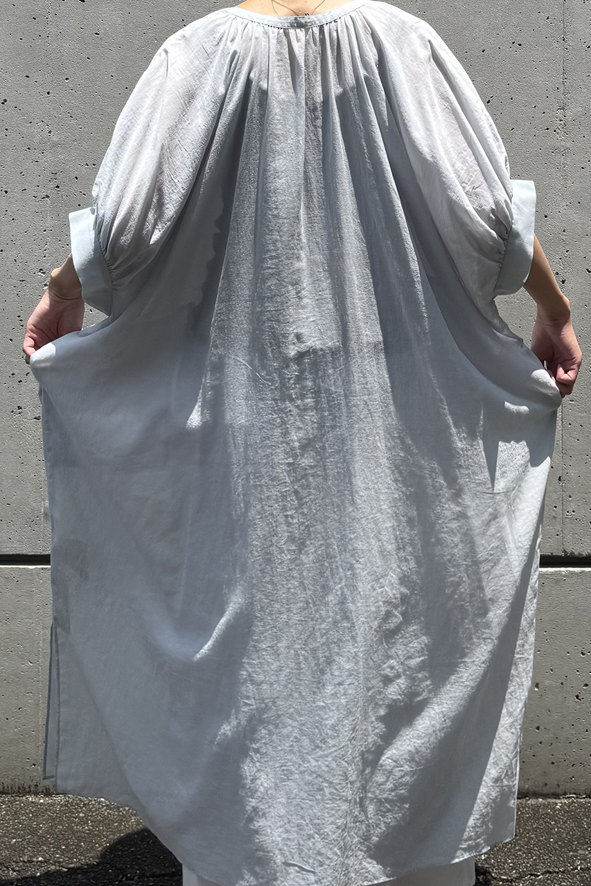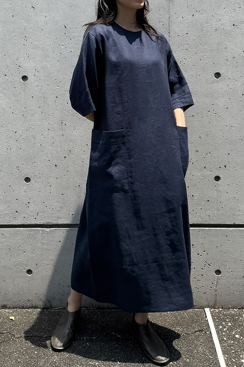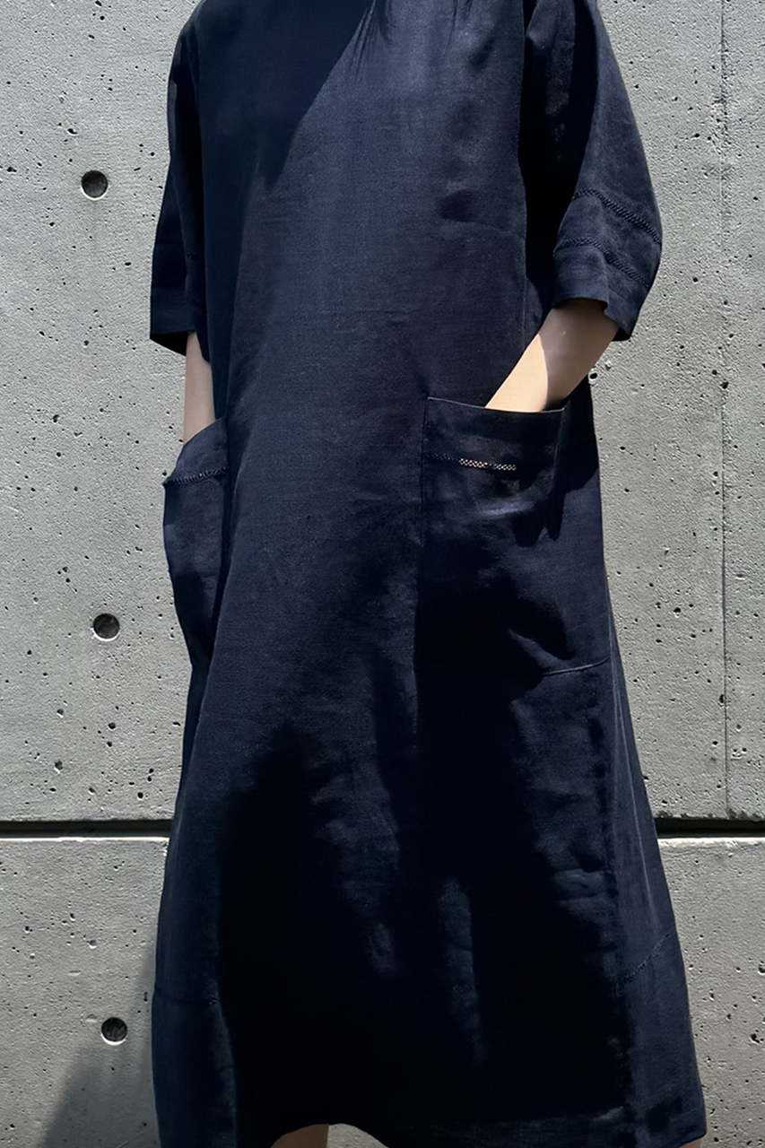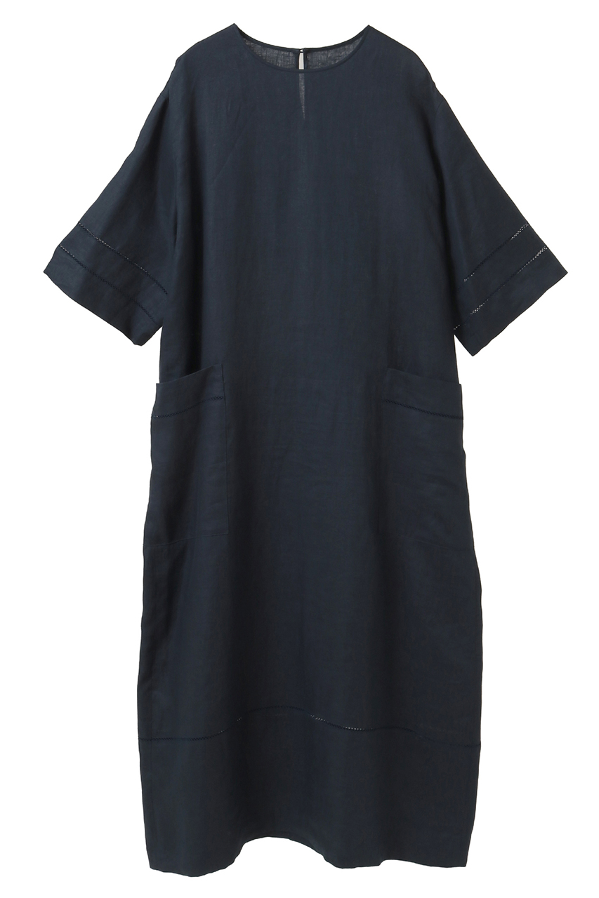 リネン地のさらっと着れるワンピース。ポケットや袖周りに細かいレースを施したシンプルな一枚です。