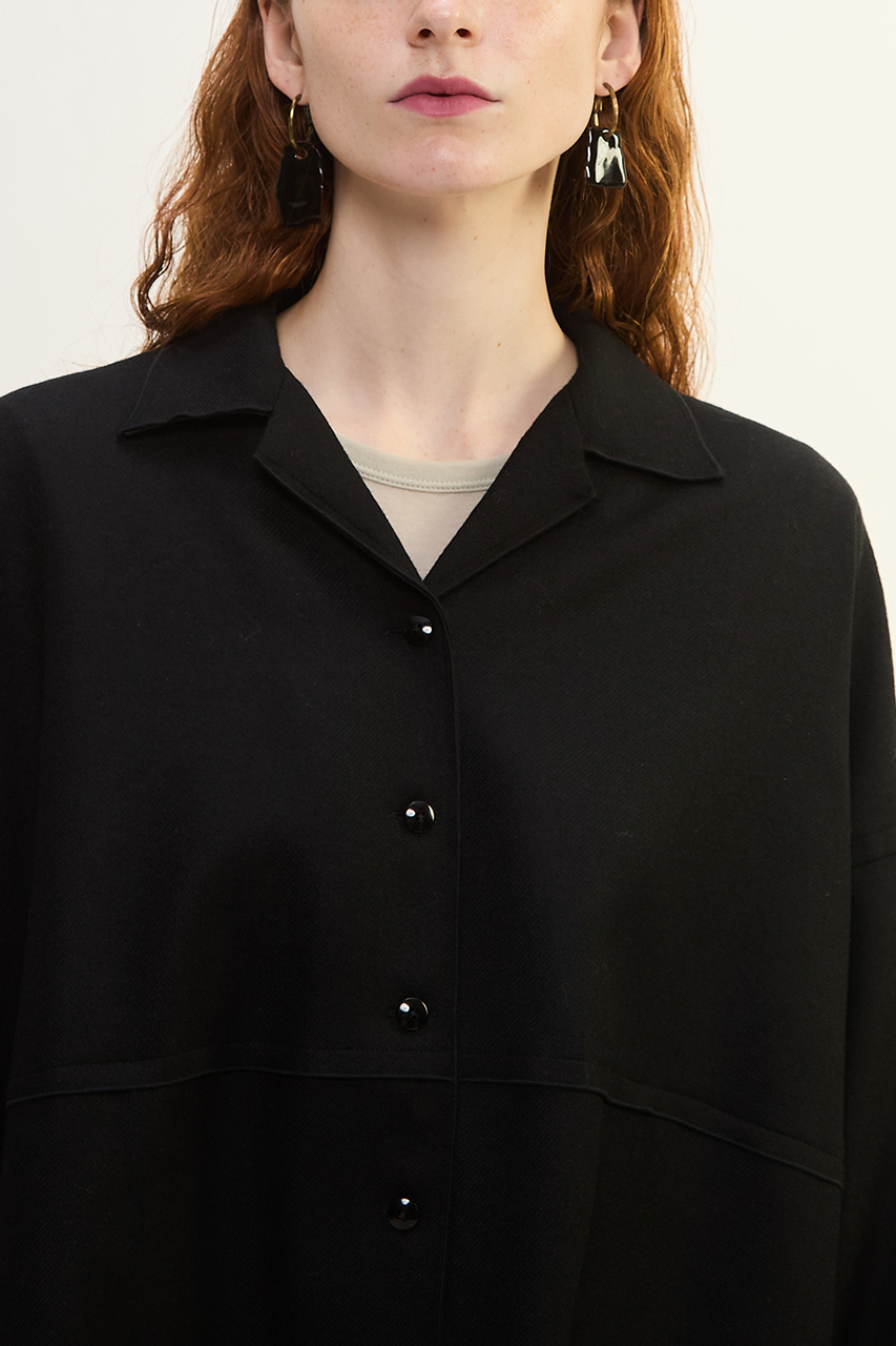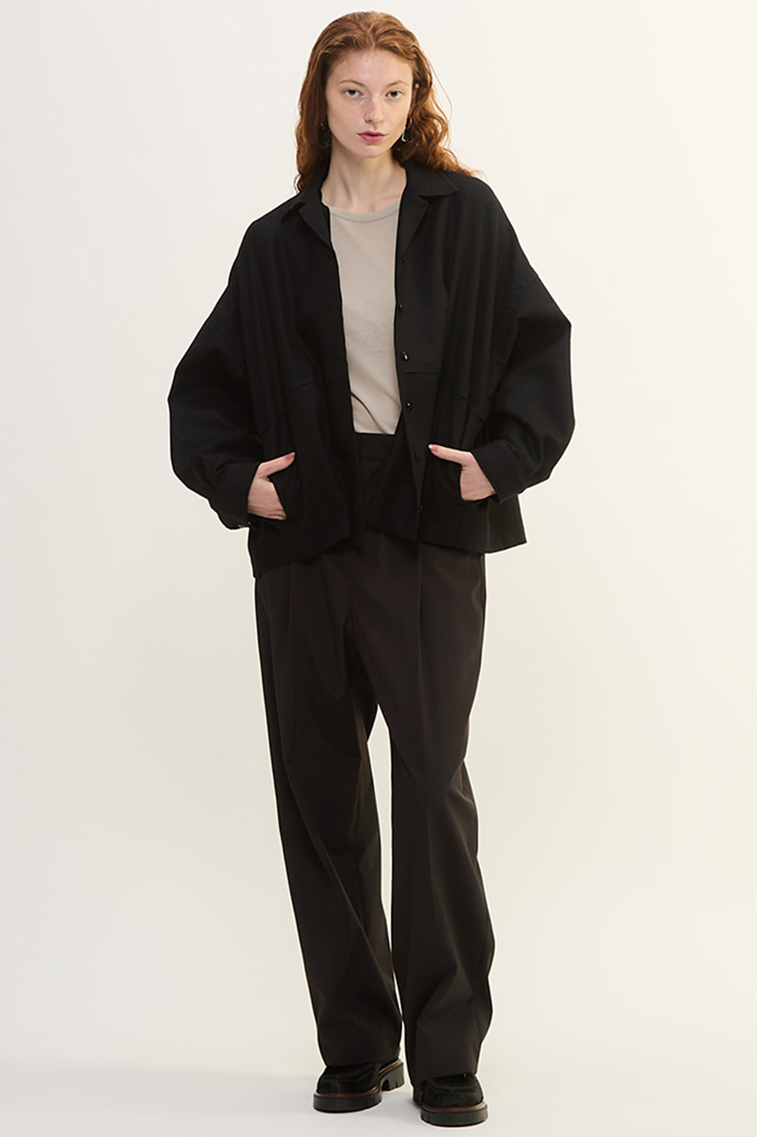 開襟シャツのようなシルエットのジャケット。薄手のウール素材は、見た目の重厚感と軽い着心地を兼ね備えた3シーズン着れるアイテム。
