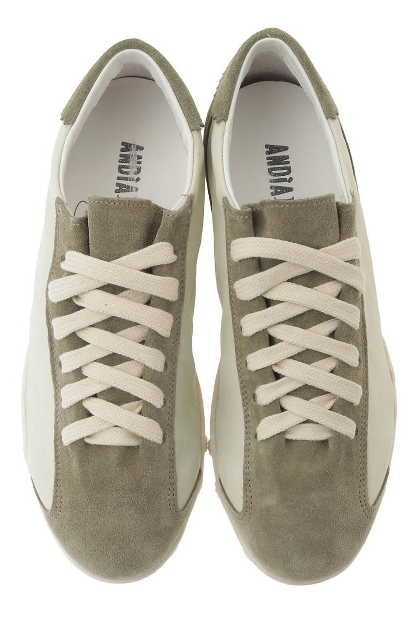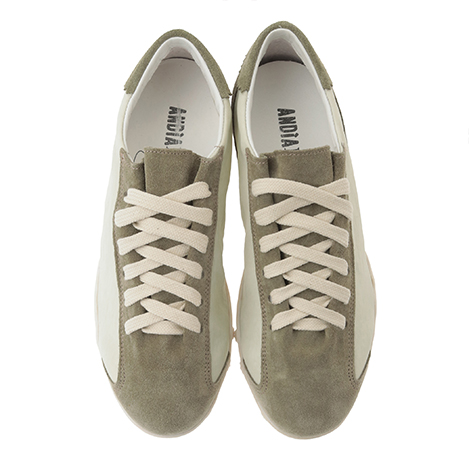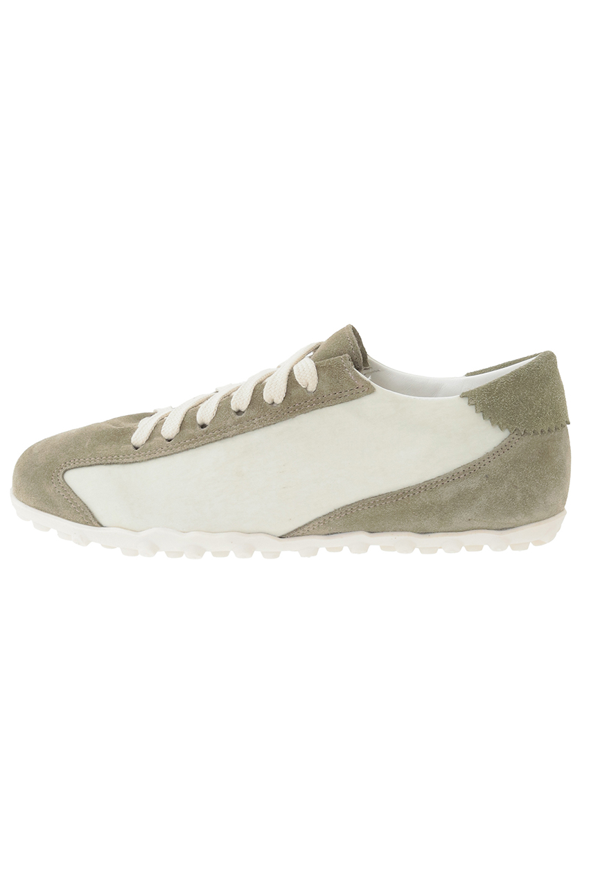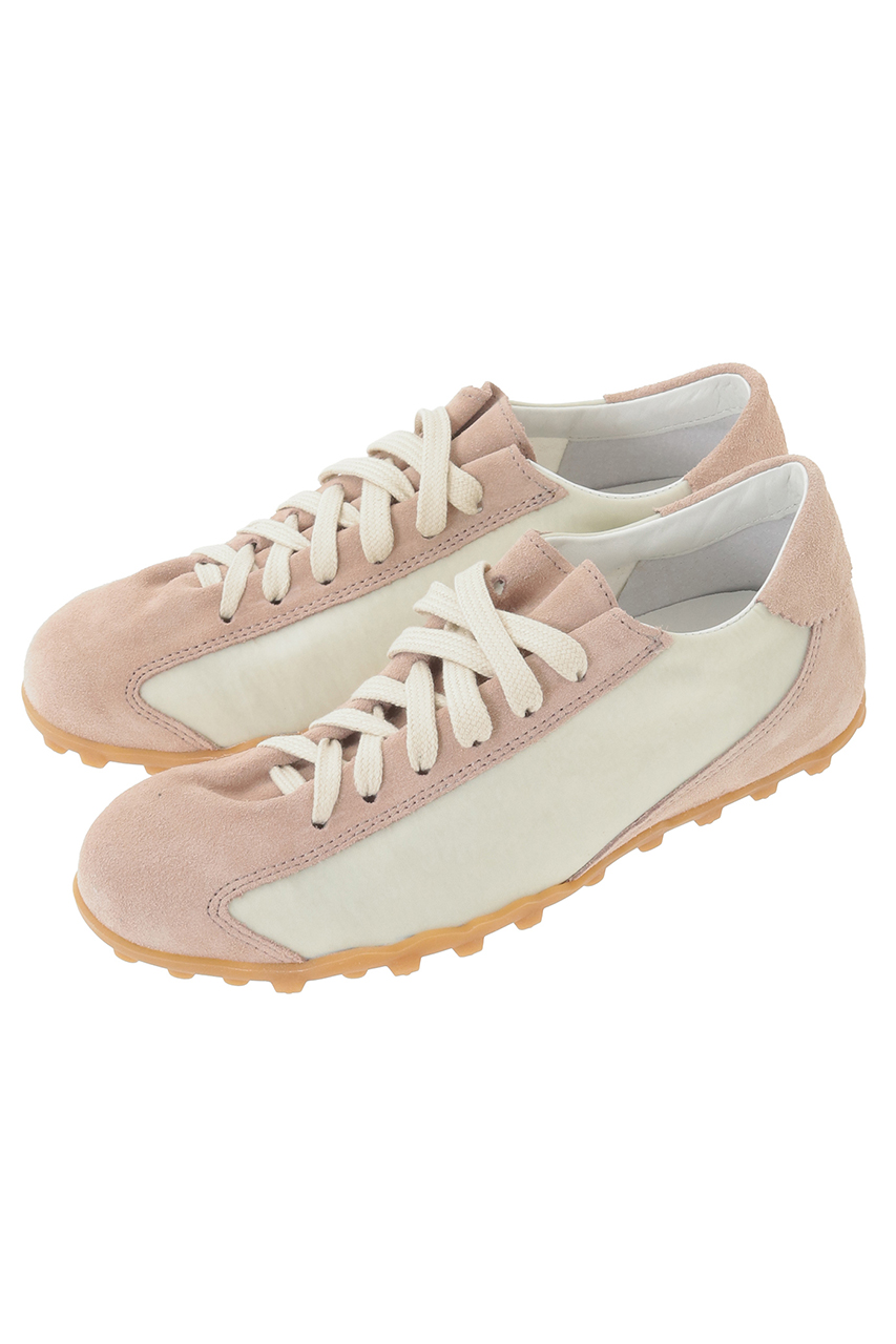 テニスシューズのようなスポーティーなフラットスニーカー。薄いソールで軽い履き心地が特徴です。今っぽいシルエットに、牛革とナイロン素材のボディが、いつものコーディネートにも馴染みます。カーキとローズの2色展開。
