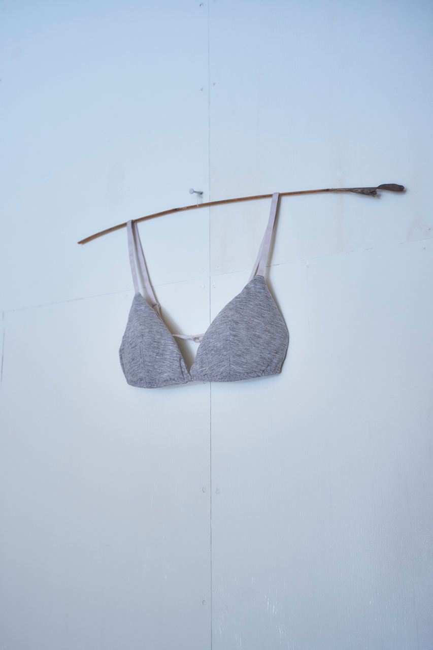 かぶりタイプのトライアングルブラ。カップ部分は表裏コットンヤク天竺。ウレタンパッドを使用しているので、しっかりバストにフィットします。バックスタイルはゴムのみの華奢なスタイル。アジャスター付きでアンダーが調整可能。