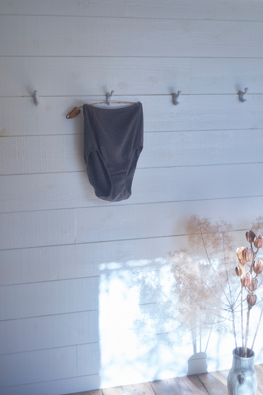ヒップからお腹、腰回りを暖かくすっぽりと包んでくれるスタンダードショーツ。表は全面コットンヤクフライス、マチ肌側はコットン天竺。
