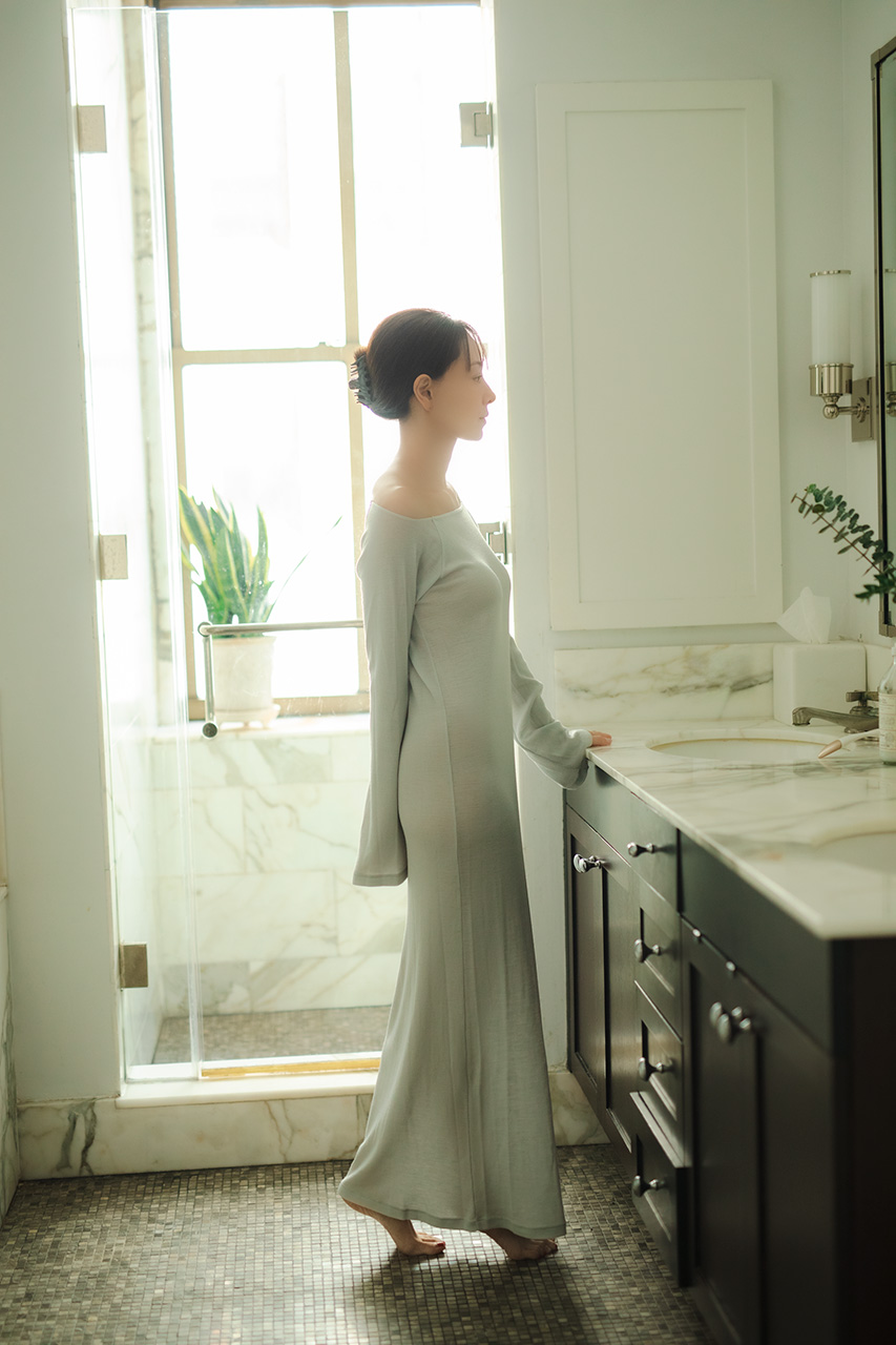 オフショルダーとして着用可能なロングワンピース。ウールの艶とフレアスリーブが、女性らしさを引き立てます。高伸縮素材&インゴム仕立てで、驚くほど快適な着心地と美しいシルエットを両立しました。