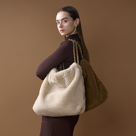 ざっくりとしたカジュアルな雰囲気ながら、ゴールドチェーンのハンドルがリュクス感を添えるシアリング素材のトートバッグ。A4サイズも収まる大容量で、普段使いはもちろん通勤にも使えるのが◎。実用性と存在感を兼ね備えた頼れる一品は、毎シーズン人気のアイテム。