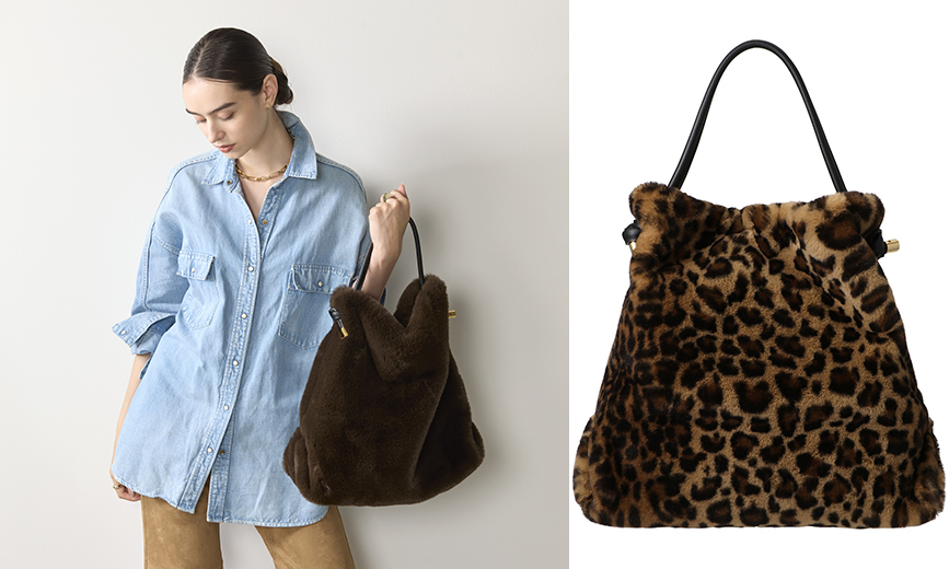 ふわふわのレッキスラビット調フェイクファーが目を惹くショルダートート。上品な光沢と柔らかな手触りが魅力で、カジュアルにもきれいめにもマッチ。こちらもA4サイズ対応なので、荷物の多いオフの日や通勤にもおすすめ。今シーズン注目のレオパード柄も要チェック!