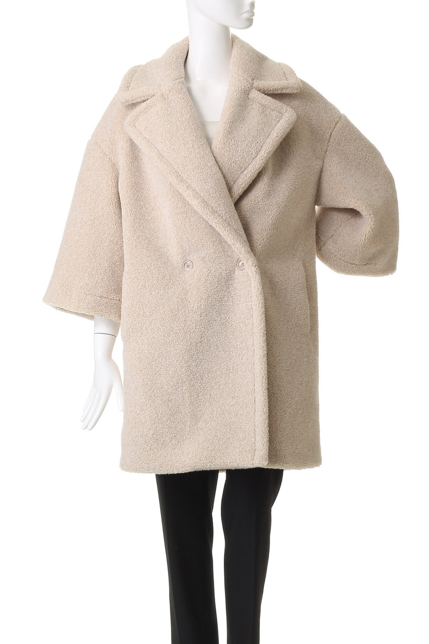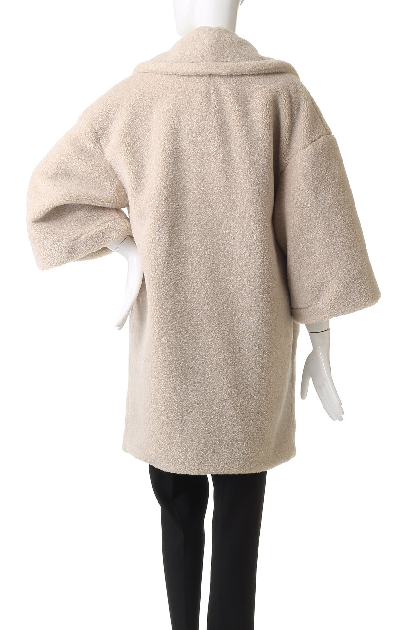 ふんわりとボリュームのあるファーを全面に使用することでインパクトのある表情をもたらすポンチョ風コート。ポリエステルのカールボアは、カールした毛足は、空気を含むため、軽く、暖かく、柔らかな着心地が魅力。ベースの生地にはジャージを使用しており、伸縮性にも優れていつでも快適。ややゆったりとしたシルエットで中に合わせるものを選ばないのが◎。
