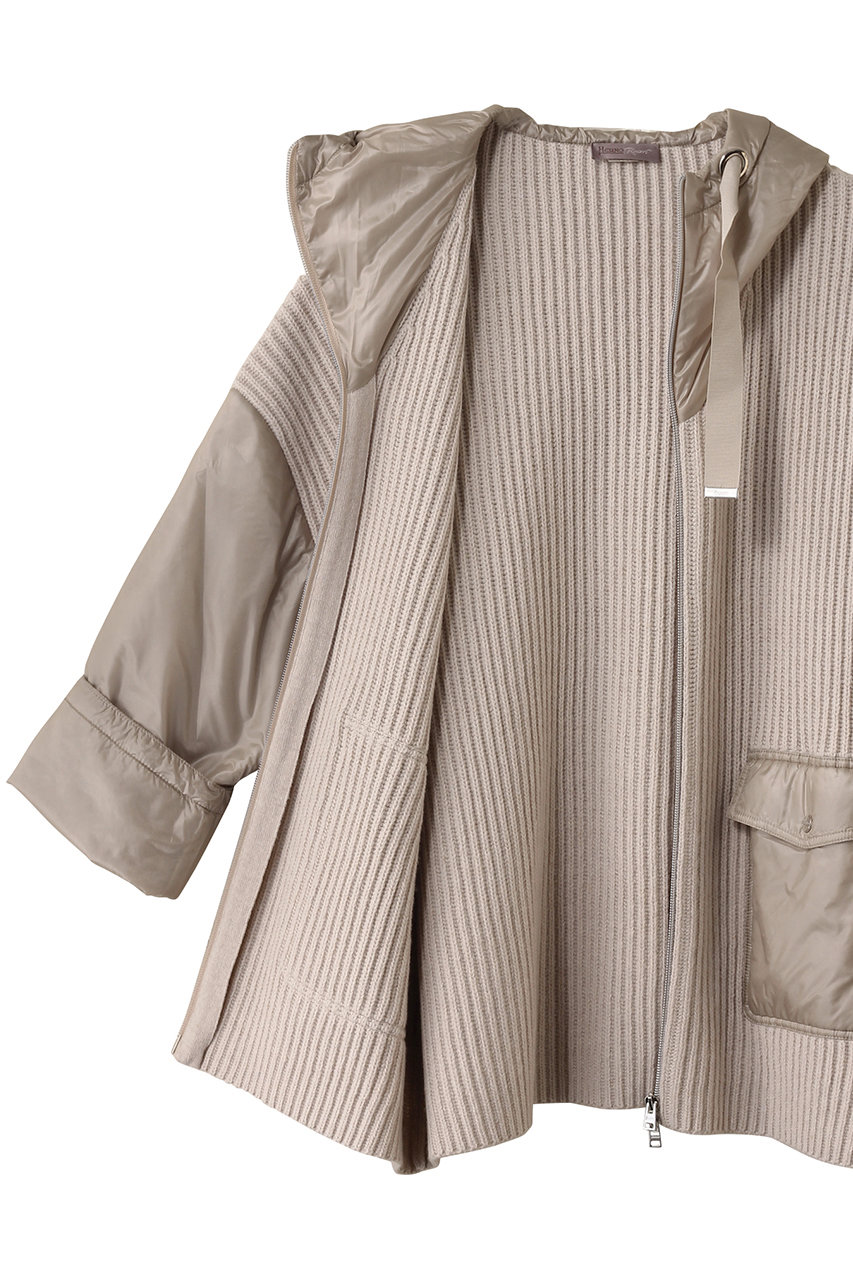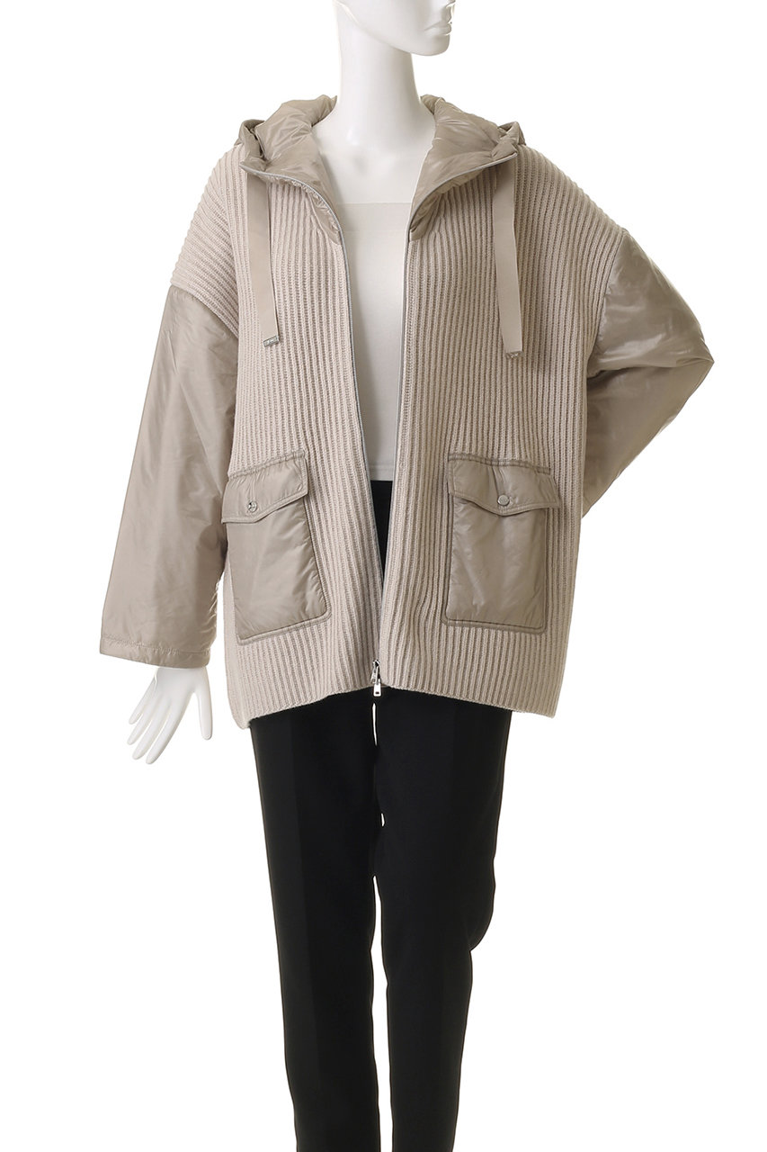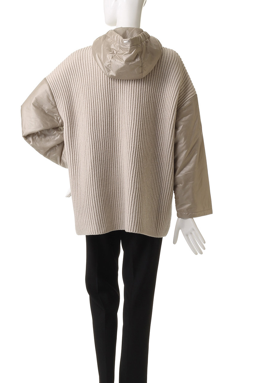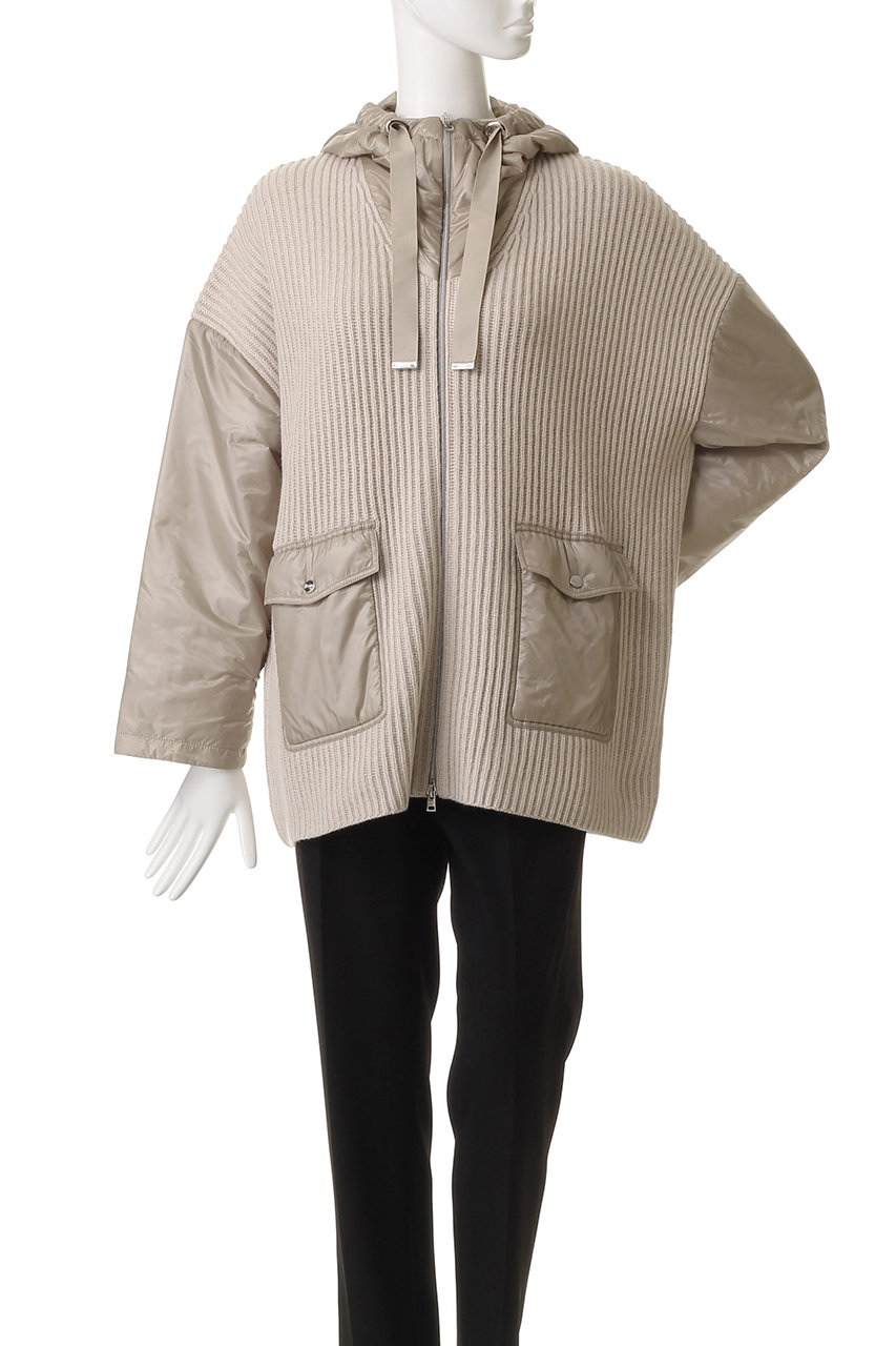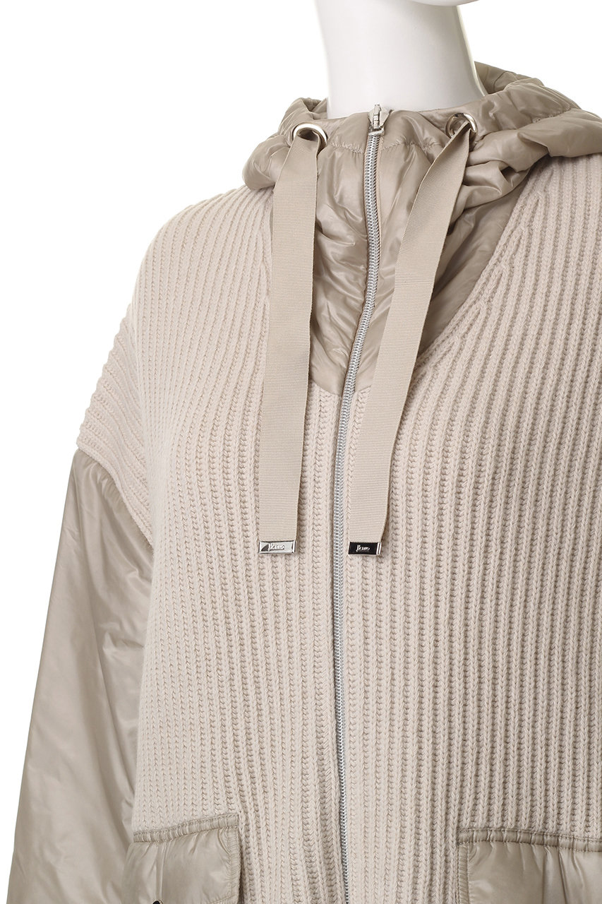旅をキーワードにラグジュアリー&コンフォタブルに特化したライン"HERNORESORT"。こちらは「HERNO」定番の軽量ナイロンとニットを組み合わせたハイブリットコート。リラックス感とカジュアル感の強いニットアウターも、柔らかな色味と風合いの素材を使用することで、洗練された雰囲気に昇華。リブ編みのざっくりした表情で、20デニールの超極細糸で織られた撥水ナイロンを使用して、柔らかな着心地と圧倒的な軽さ、上品な光沢でクラス感が手に入る。