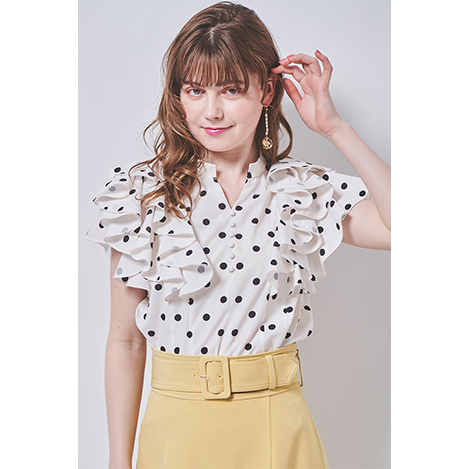 たっぷりのフリルでボリュームを出した、1枚で華やかに決まるフェミニンなブラウス。襟ぐりのキーネックがほどよい抜け感も演出してくれます。パンツやタイトめなスカートとのスタイリングがおすすめです。