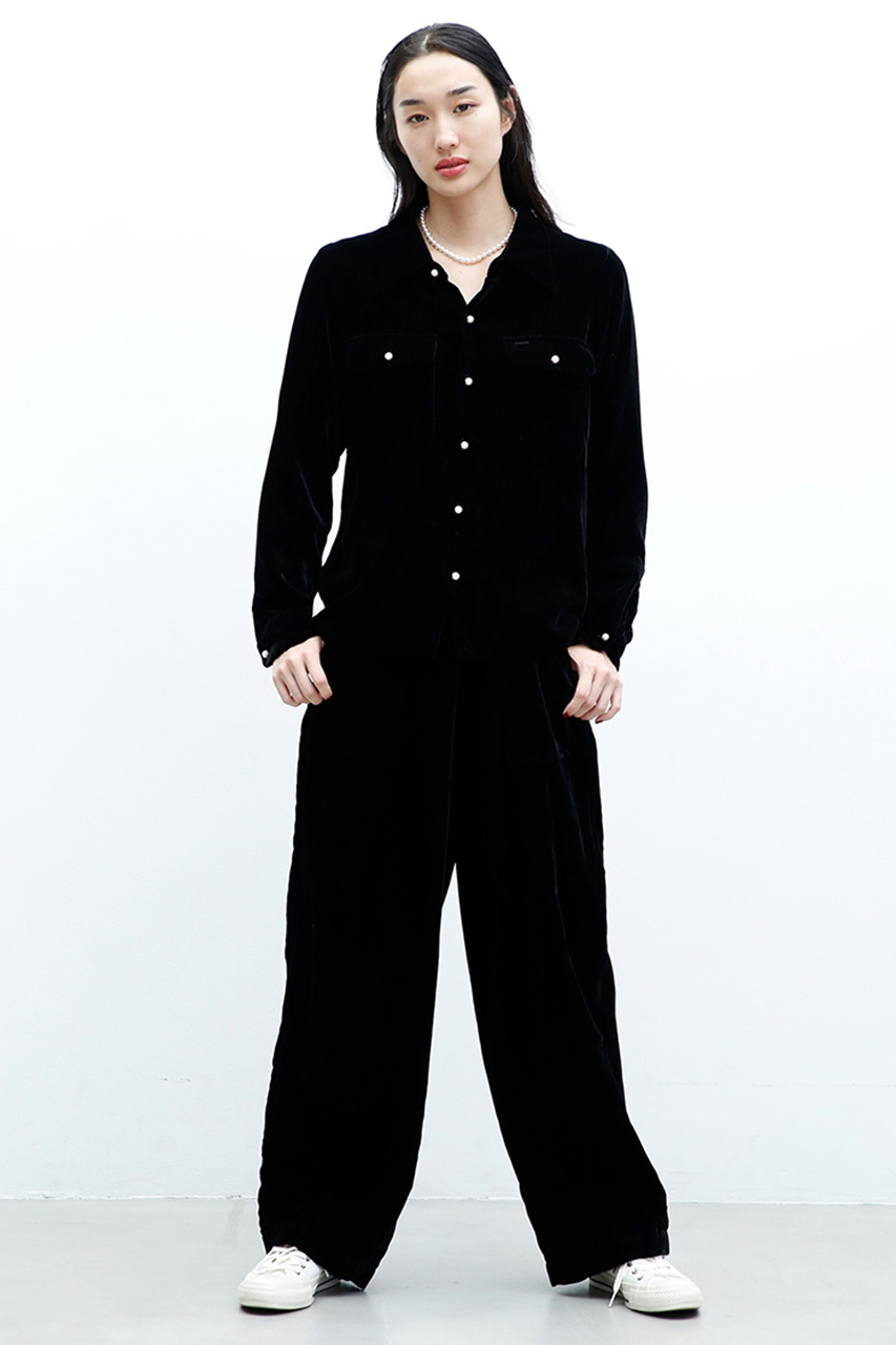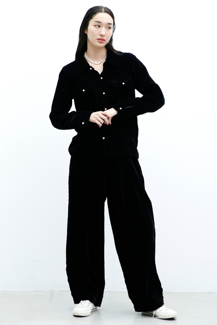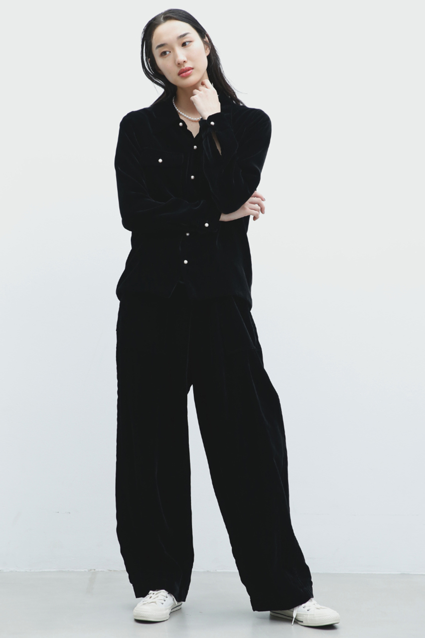薄手でソフトなレーヨンベルベットを贅沢に使用した薄手でソフトなレーヨンベルベットを贅沢に使用したパンツ。素材の持つ艶と落ち感が、ワークパンツに新しい表情を与えます。ワンウォッシュ風の雰囲気を漂わせながらも、ベルベット素材ならではのカジュアルとモードの絶妙なバランス。柔らかい生地が生み出すドレープは、動くたびに空気をまとい、ウエストの絞りやつまんだ裾がシルエットを立体的に引き立てます。無骨なディテールと繊細な素材の掛け合わせが、ブランドらしさを感じさせる一本。冬の装いを素材でアップデートしてくれる存在です。