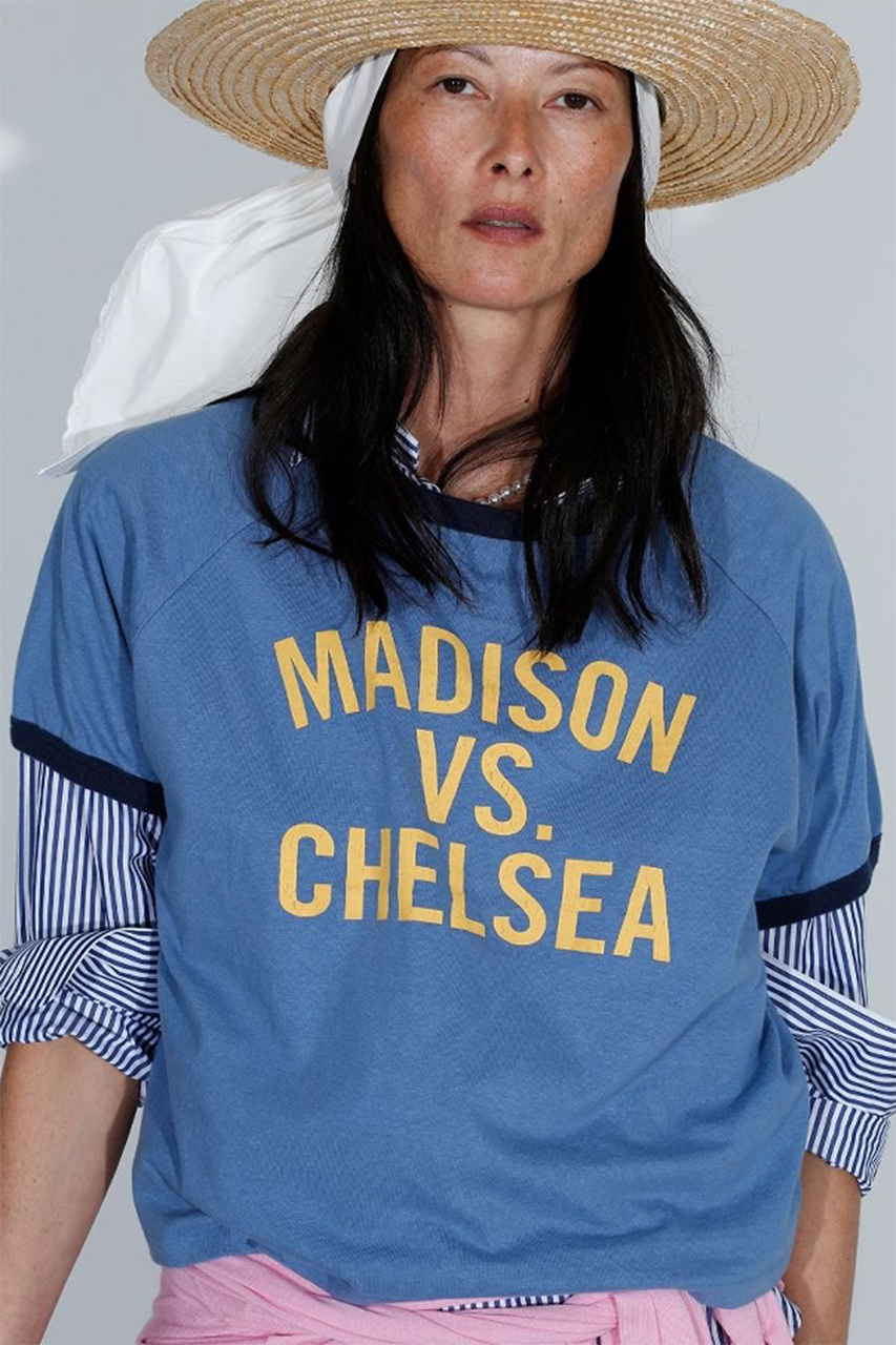 スーピマコットンの落ち綿を使用した、風合い豊かなリンガーTシャツ。自然なムラ感と経年変化が、着込むほどに表情を深めます。短めの着丈とルーズなシルエットで、タックインせずともバランス良く着こなせる一枚。アイコニックなプリントを、あえてカレッジムードで仕上げました。