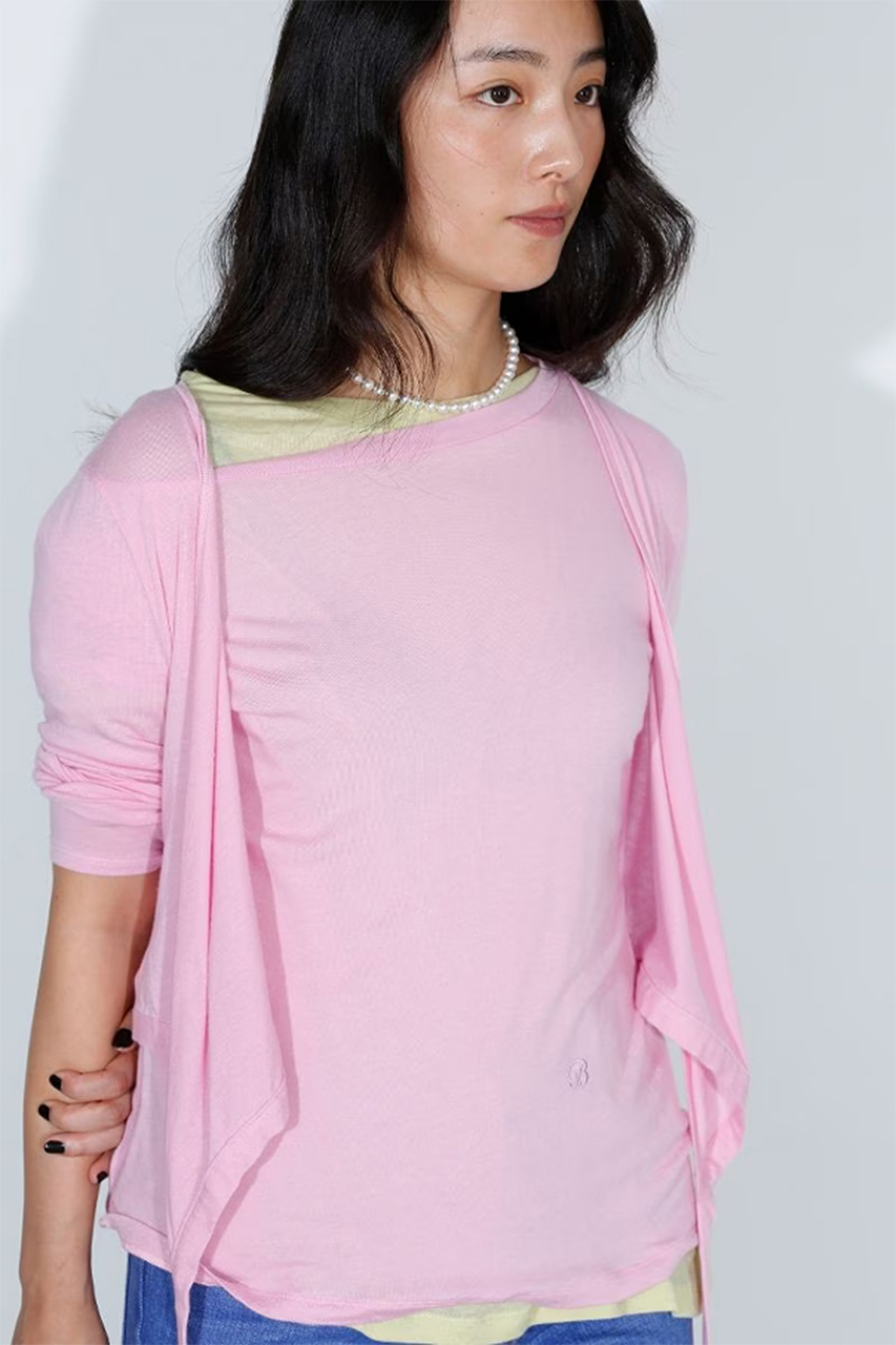 シルク混ならではのなめらかなタッチと、軽やかなシアー感が魅力のカットソーシリーズ。首元にゆとりを持たせたルーズフィットTはレイヤードしやすく、カシュクールTは身体に沿うフォルムと伸縮性でスタイリングにリズムをプラス。同色ピンクの重ね着で、2026年春夏らしい軽さと奥行きを演出します。