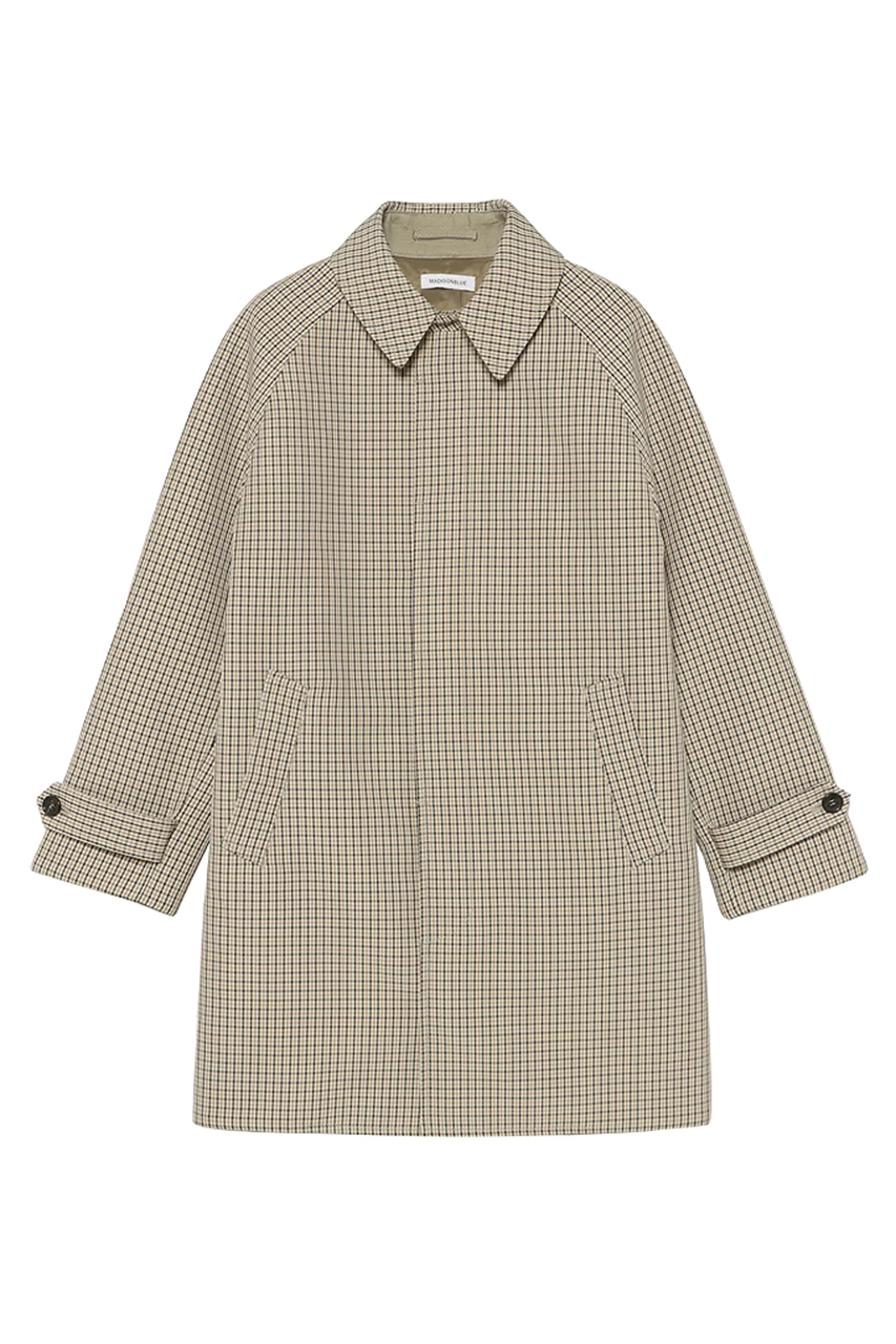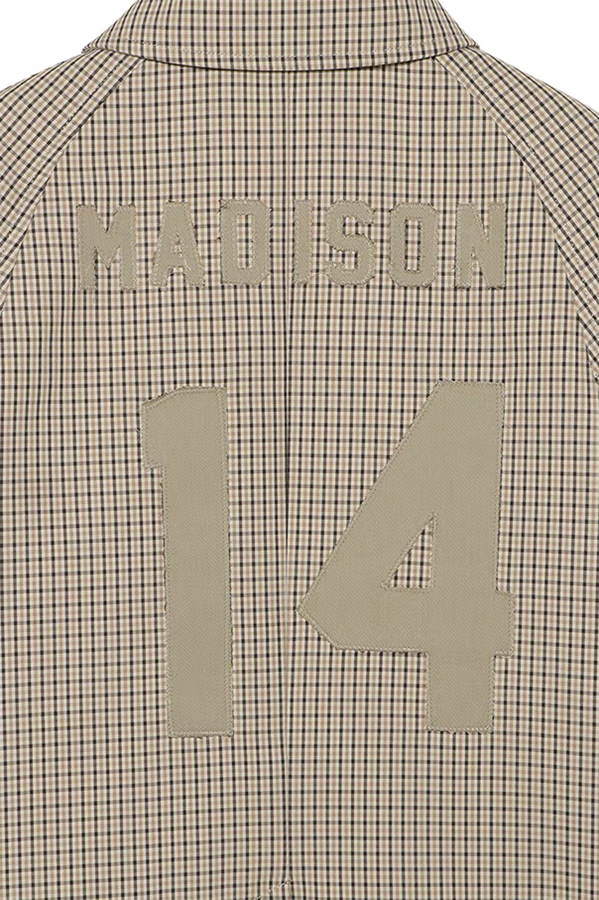 チェック×カーキのボンディング素材が、ミニマルなフォルムにさりげない奥行きを与えます。背中には千鳥がけによるナンバリングを施し、控えめなアクセントに。シーズンをまたいで活躍する、完成度の高いベーシックアウターです。