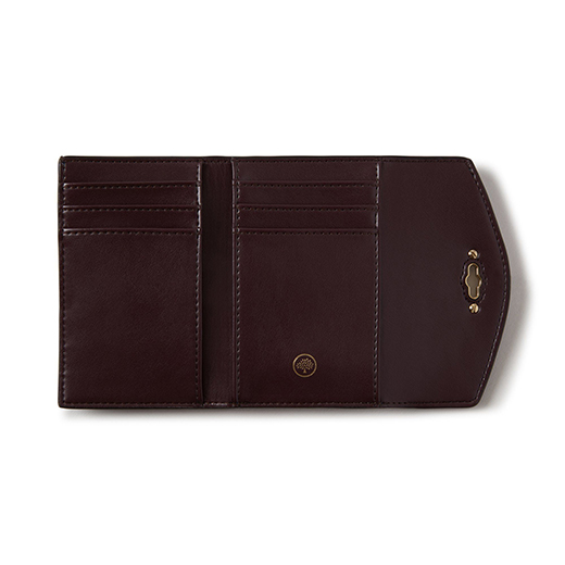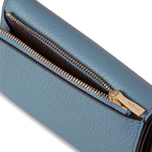 “DARLEY FOLDED MULTI-CARD WALLET”は、「マルベリー」の象徴ともいえるポストマンズロックをフラップに配した、クラシカルでありながらモダンな佇まいが魅力。細かなシボ模様を型押ししたソフトなカウレザーを使用しており、しなやかな手触りで傷が目立ちにくく、日常使いにも最適。表面は澄んだブライトンブルー、裏面には深みのあるダークブラウンを組み合わせた、上品なカラーリングもポイント。