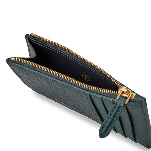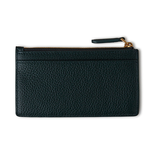 さらにコンパクトなコインケースをお探しなら、こちらのロングカードホルダーがおすすめ。マチ付きのジップコンパートメントに加え、背面にはスリップポケットを備えており、お札を折って収納することも可能。ソフトゴールド仕上げの金具と、ゴールドの箔押しロゴがさりげないアクセントに。ブランドを象徴する人気カラー“マルベリーグリーン”は完売必至!