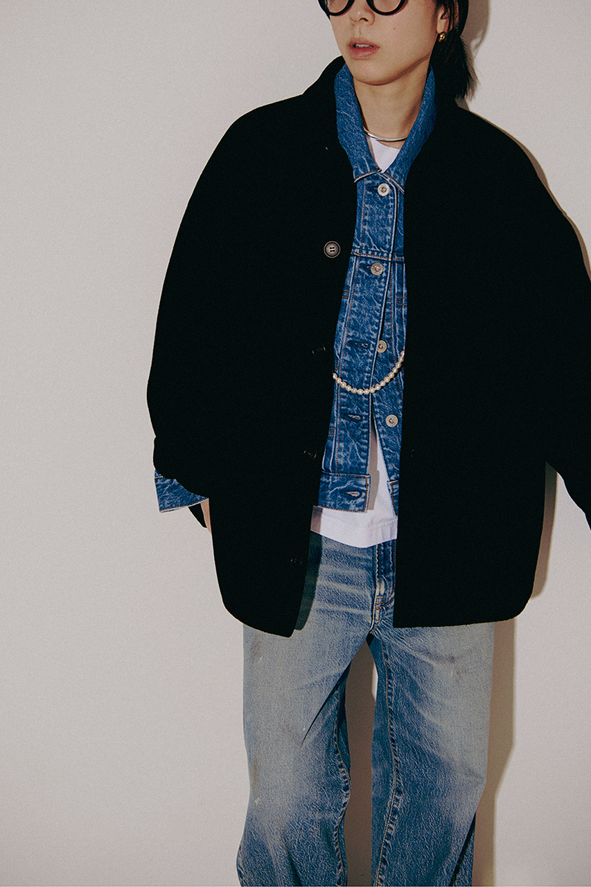 紡毛織物の片面のみを縮絨・起毛し、毛羽を短く刈りそろえた仕上げを施すことにより、もちっとした風合いが特徴のウール素材。リバー始末で高級感のある仕上がり。