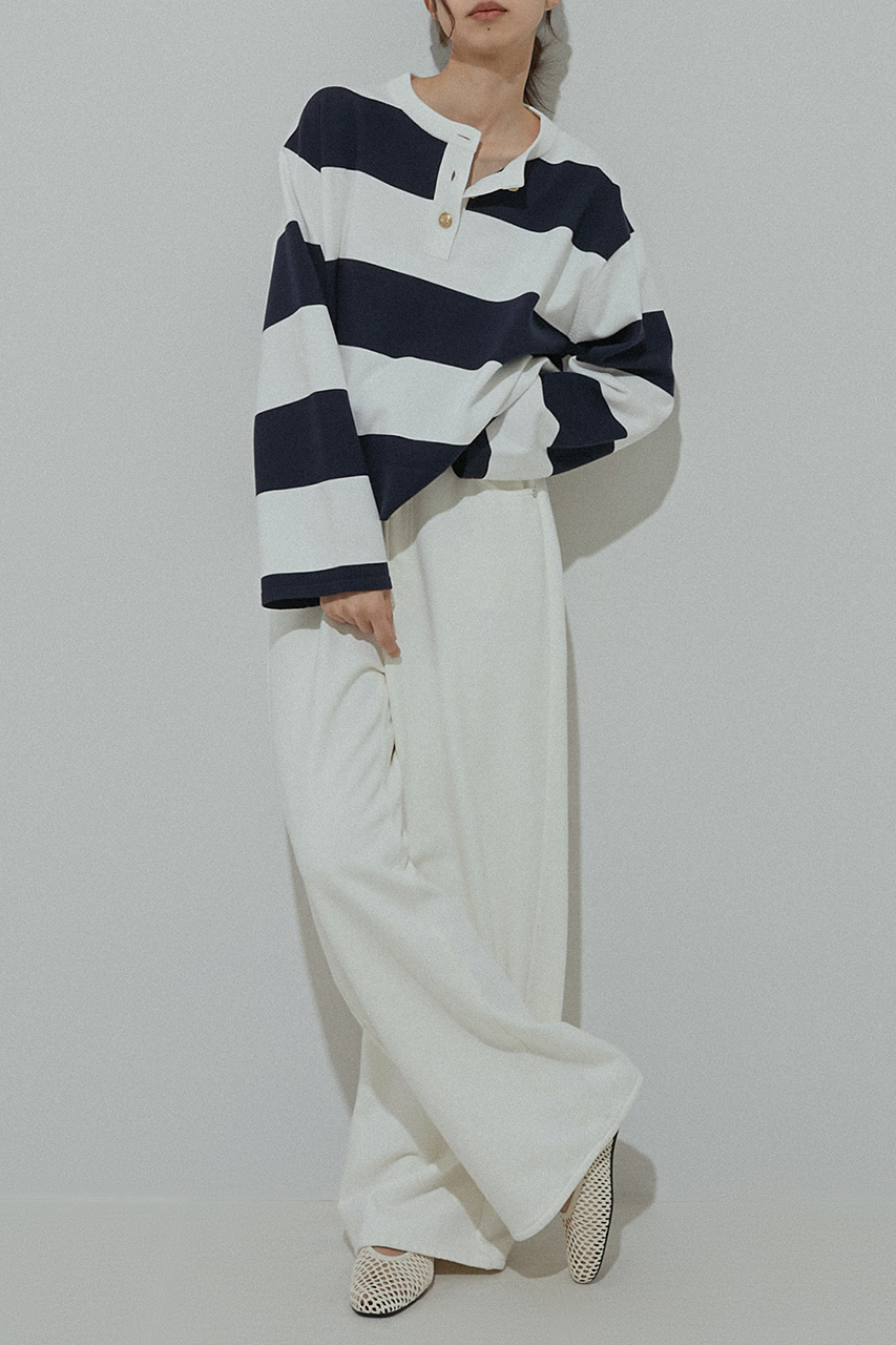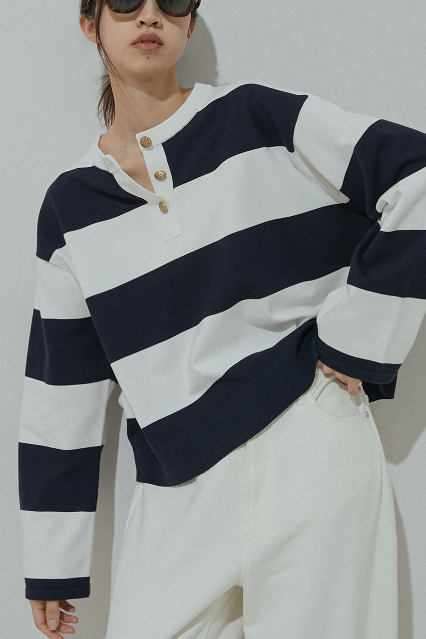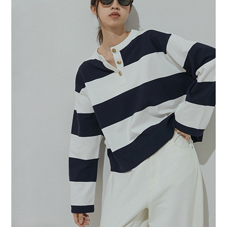 ラグビーシャツをモチーフにした、幅広なボーダー柄のスポーティカジュアルなトップス。肩を落としたオーバーサイズにショート丈で、旬を捉えたバランスが魅力。