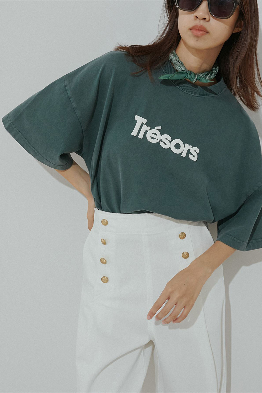 Tresors(宝物の意)のロゴが目を引く、ゆったりとしたボックスシルエットのTシャツ。厚みのある生地感にヴィンテージライクな加工がほどこされた仕上がり。