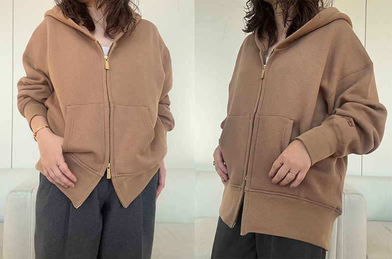 お問い合わせ多数の“ゴールドジップ フードパーカー”が、今シーズンもエルショップ限定で登場。オーバーサイズのリラックス感と、ダブルジップならではのアレンジ力が魅力です。柔らかく、もちっとした裏毛素材で季節の変わり目から真冬まで活躍。残りわずかのこの機会に、ぜひチェックしてみてくださいね。