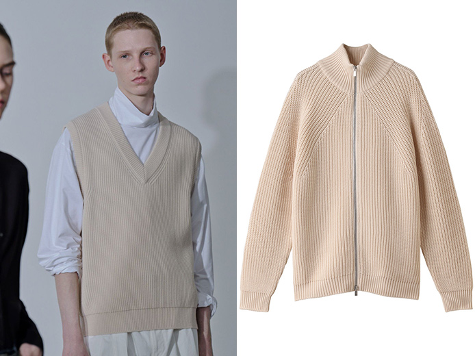 定番のシグネチャーシリーズのベスト&ドライバーズニットも、今年はアイボリーカラーをラインナップしました。毛玉の出来にくい均一でクリアな編地がほっこり感を抑えて、スタイリッシュに着こなせます。