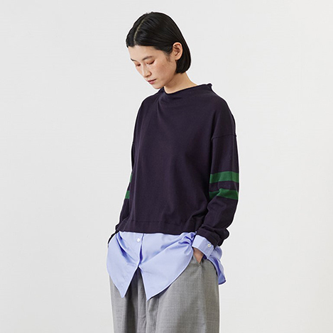 裾はタイプライター生地を重ねたようなシャツドッキングデザインのトップス。印象的な袖のボーダーは、大人のプレッピースタイルにさり気ないアクセントをプラスしてくれそう。世界最高品質の超長綿、シーアイランドコットンで、極上の柔らかなタッチとなめらかな肌触りが堪能できる。