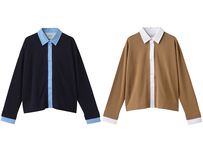 前立て、シャツカラー、カフスに配色タイプライター生地を用いたレイヤード風デザイン。タックインしてもかさばらずに、さらっと着こなせるのでまさにシャツとニットの良いとこ取り!ニット部分にはコンパクトスピン加工で毛羽立ちを抑えたコットンを使用し、すっきりとした表面感に。