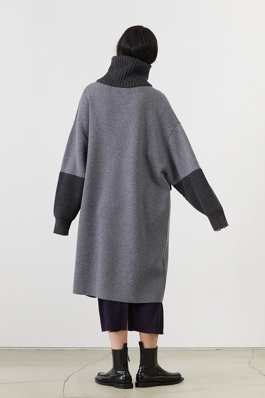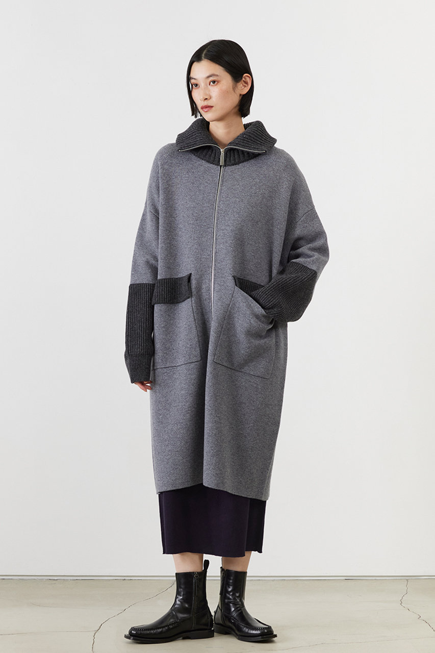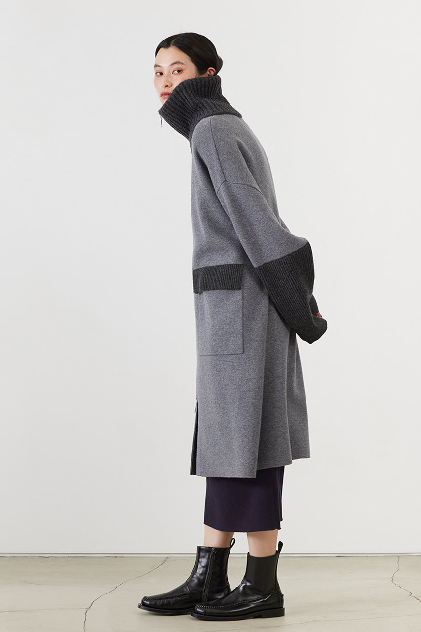ふわりと軽やかなウルトラファインメリノウールをぜいたくに度詰めで編み立て、アウターとしての十分な肉厚感を持たせたニットコート。首もとを温かく包むボリューミーな衿、袖口の畦切り替え、フラップポケットが配色のアクセントに。スポンジッシュなバルキー素材を使用した膨らみのある編地は、シンプルながらも存在感を放ち、秋冬のスタイルを格上げしてくれそう。